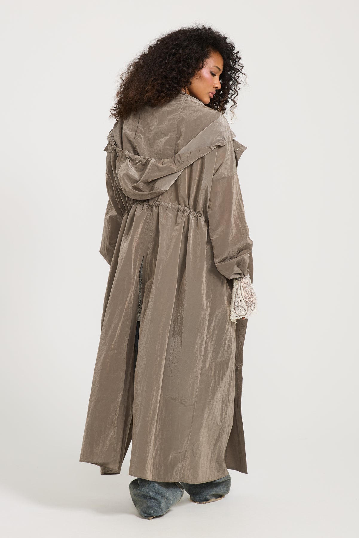 This waterproof coat can be cinched at the waist and has buttons all the way down at the front