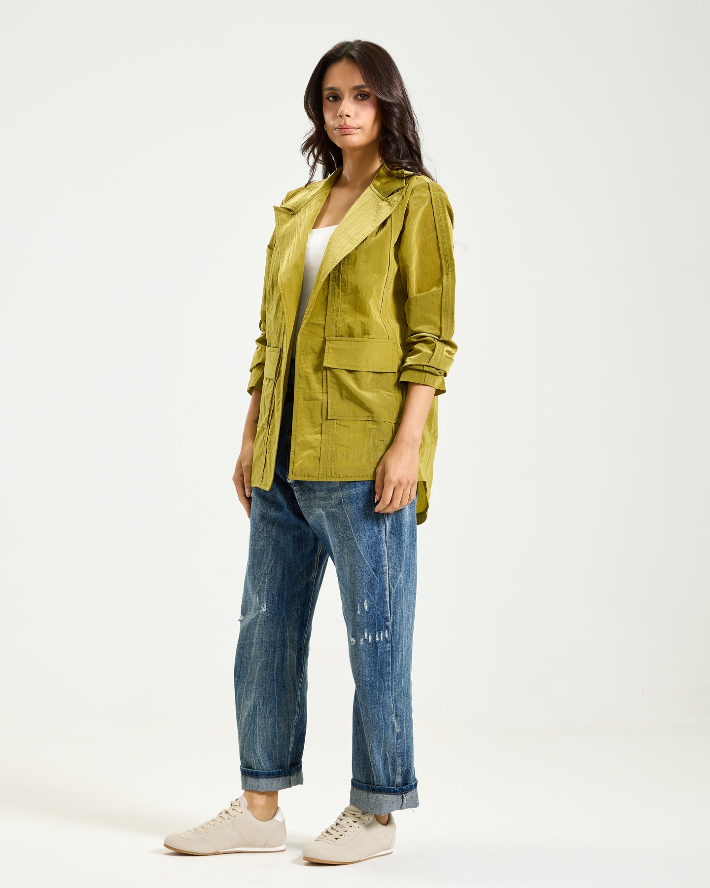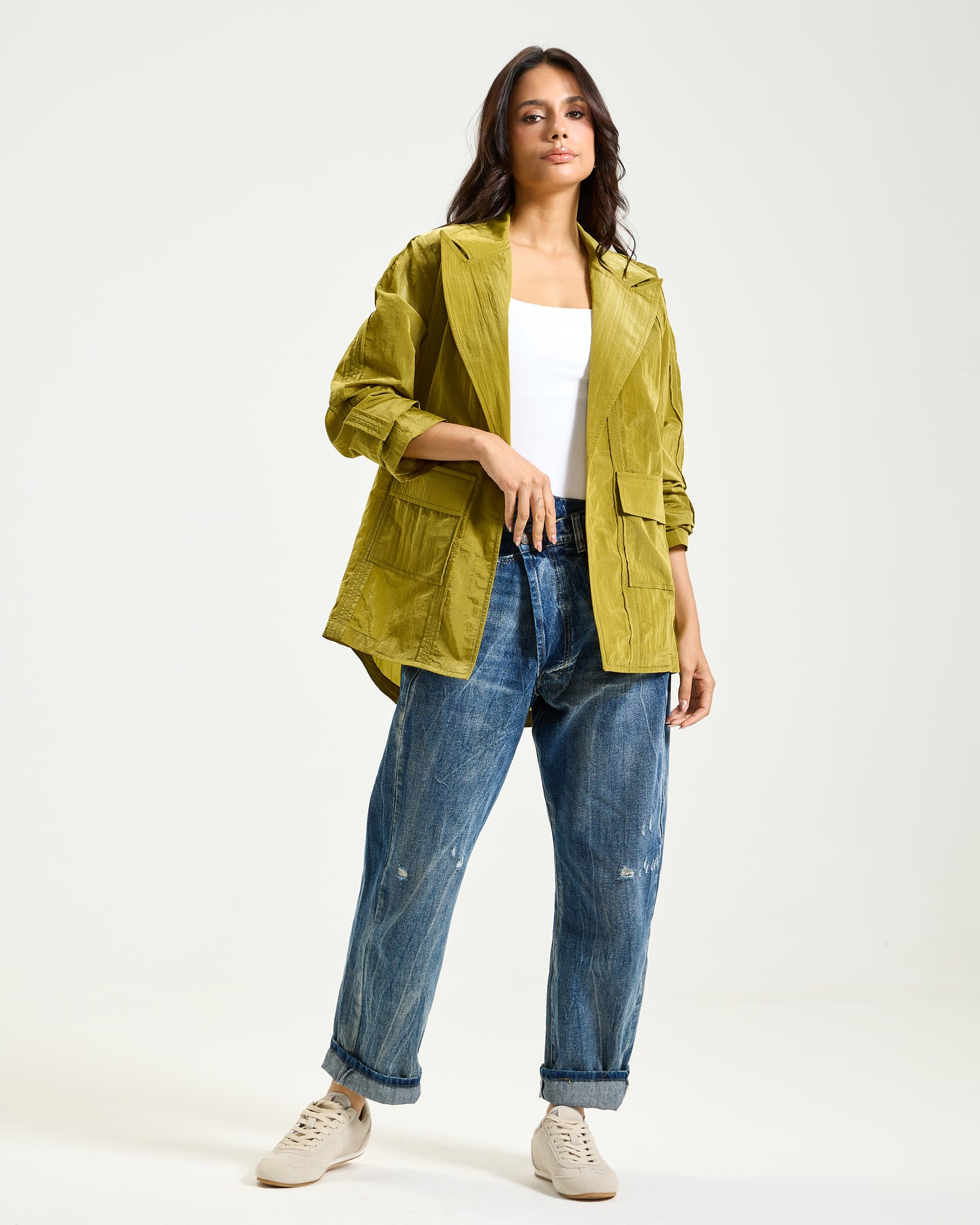 Apple green waterproof blazer with a structured silhouette and sharp lapels. Finished with utility-inspired pockets for a bold, modern edge.