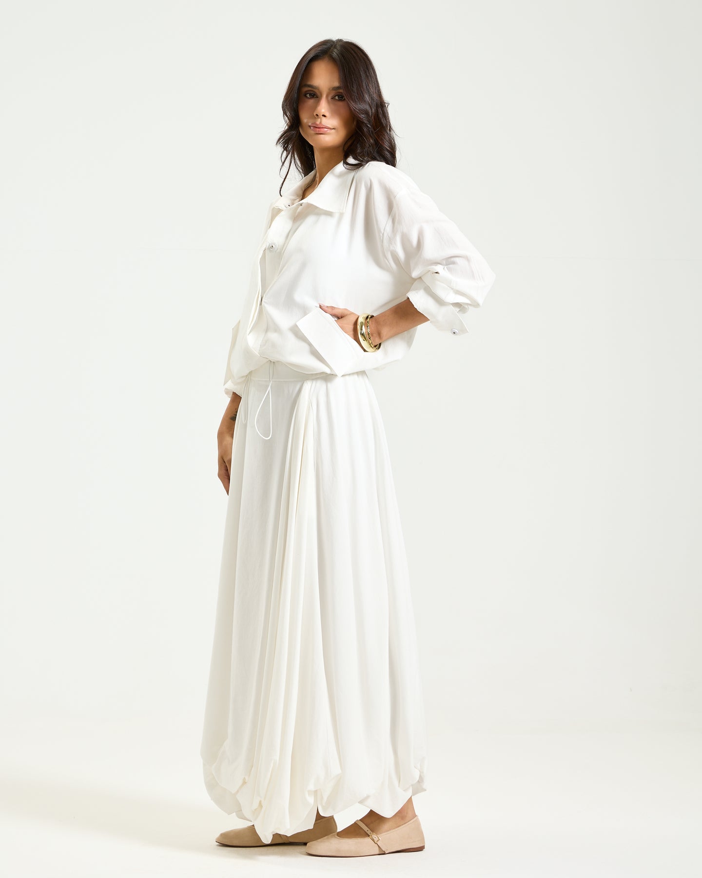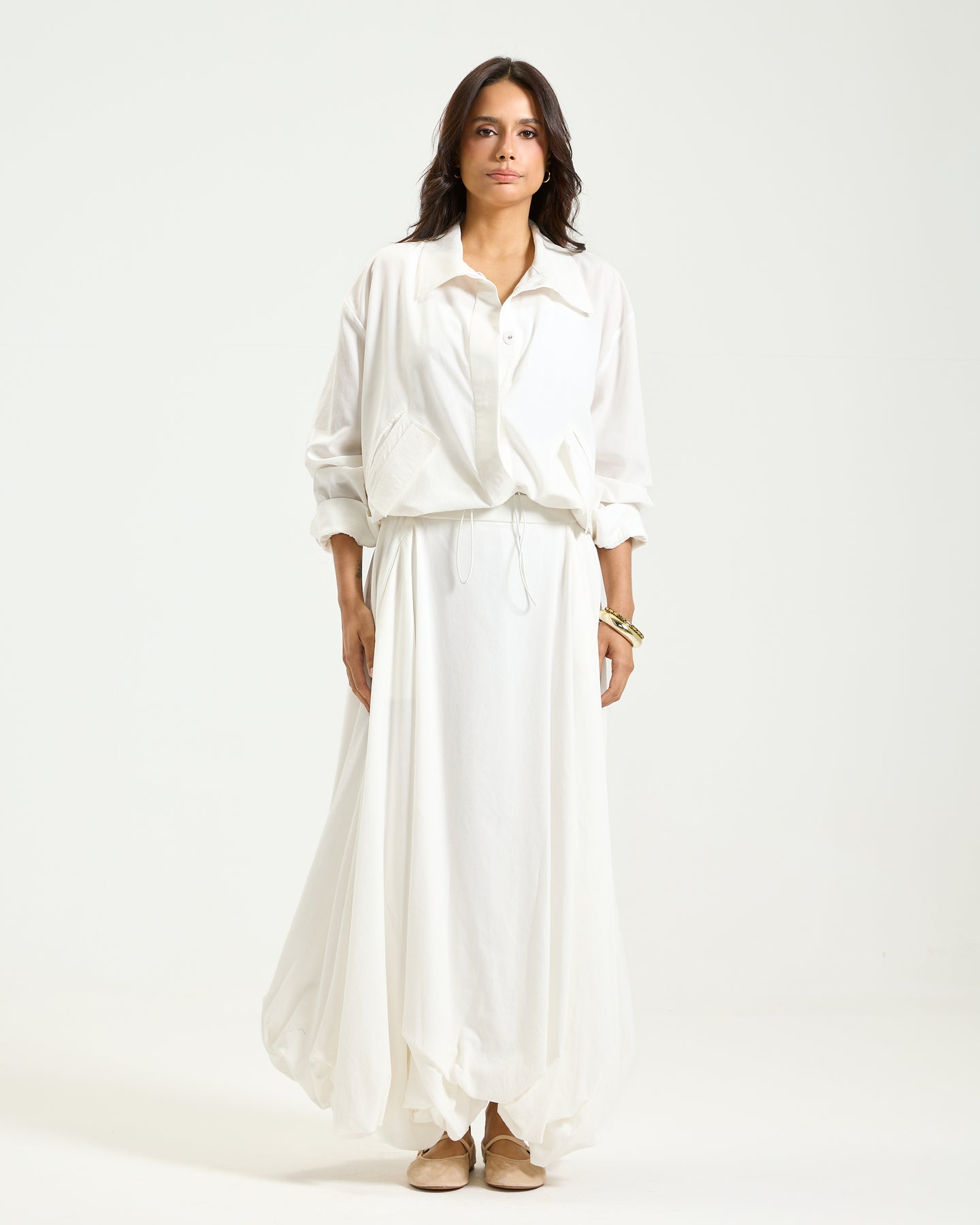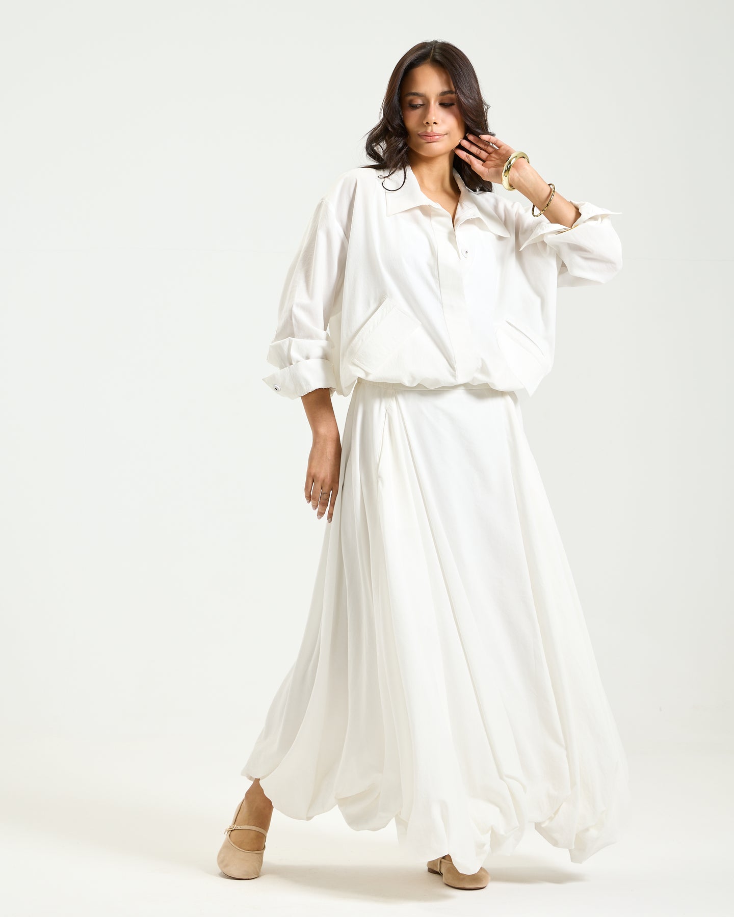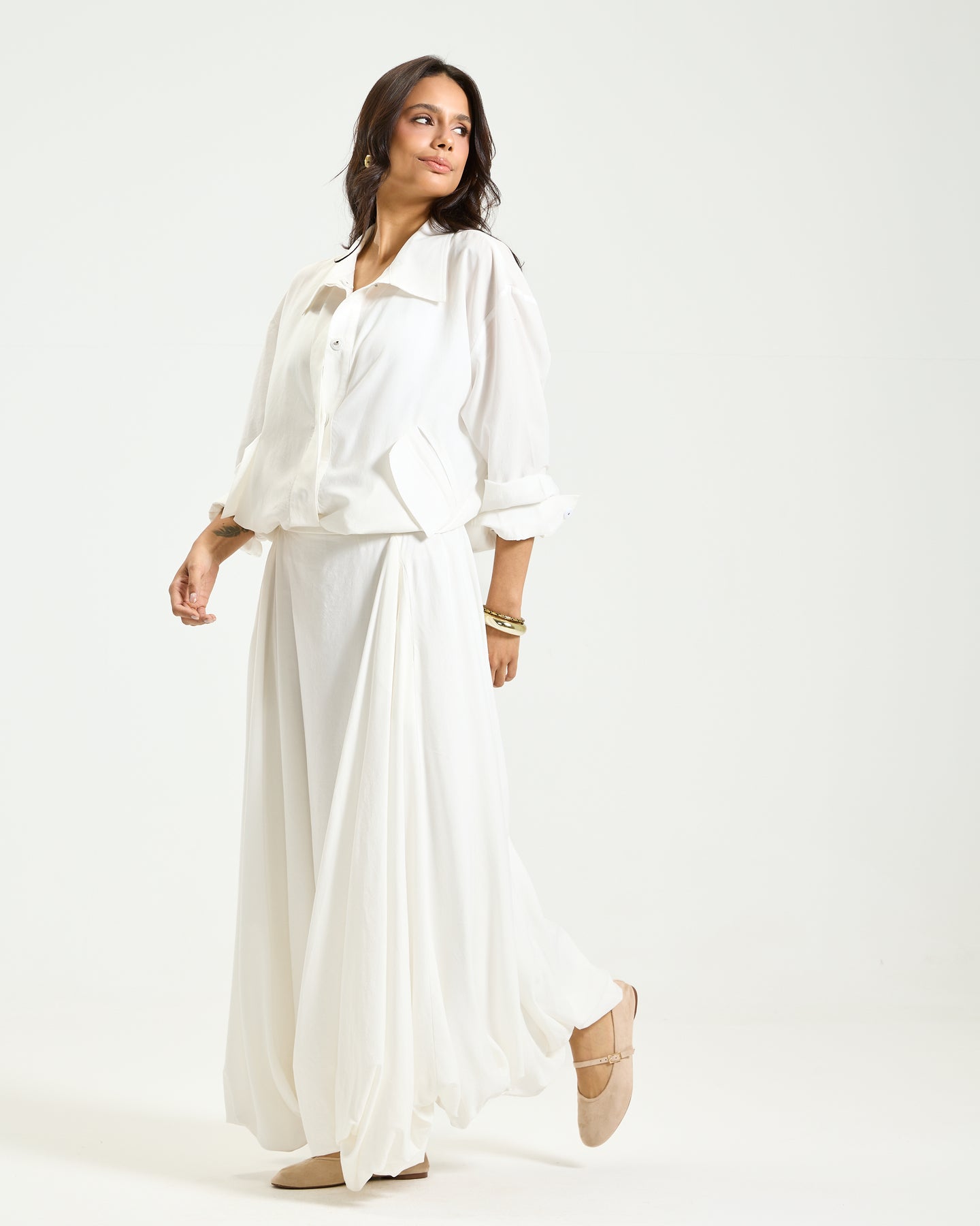 White bomber jacket with a relaxed fit, classic collar, and clean pocket details. Finished with an elasticated hem for an easy, cool look.