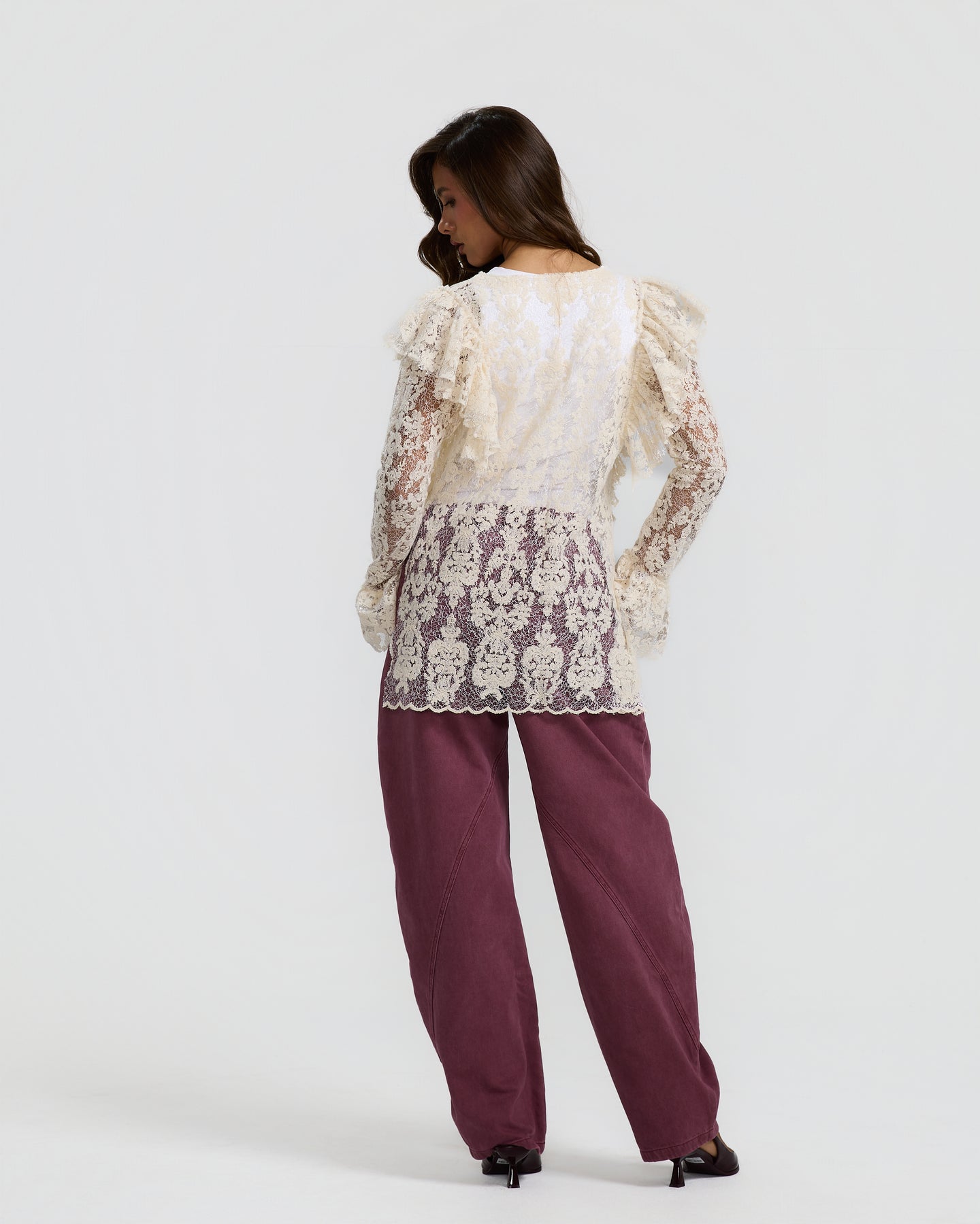 A sheer off-white lace top with soft ruffle details and flared sleeves that add a bold yet feminine touch to any look.