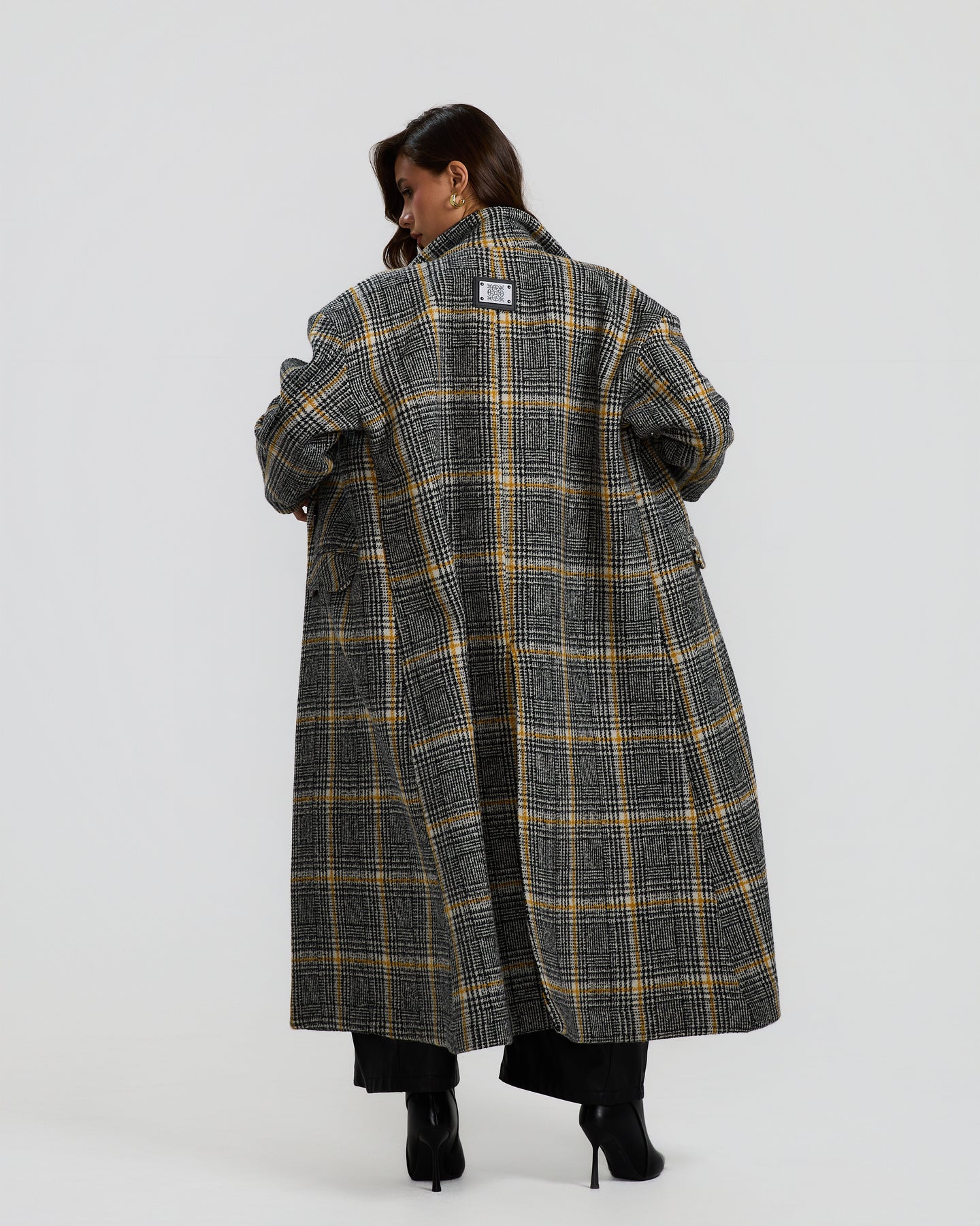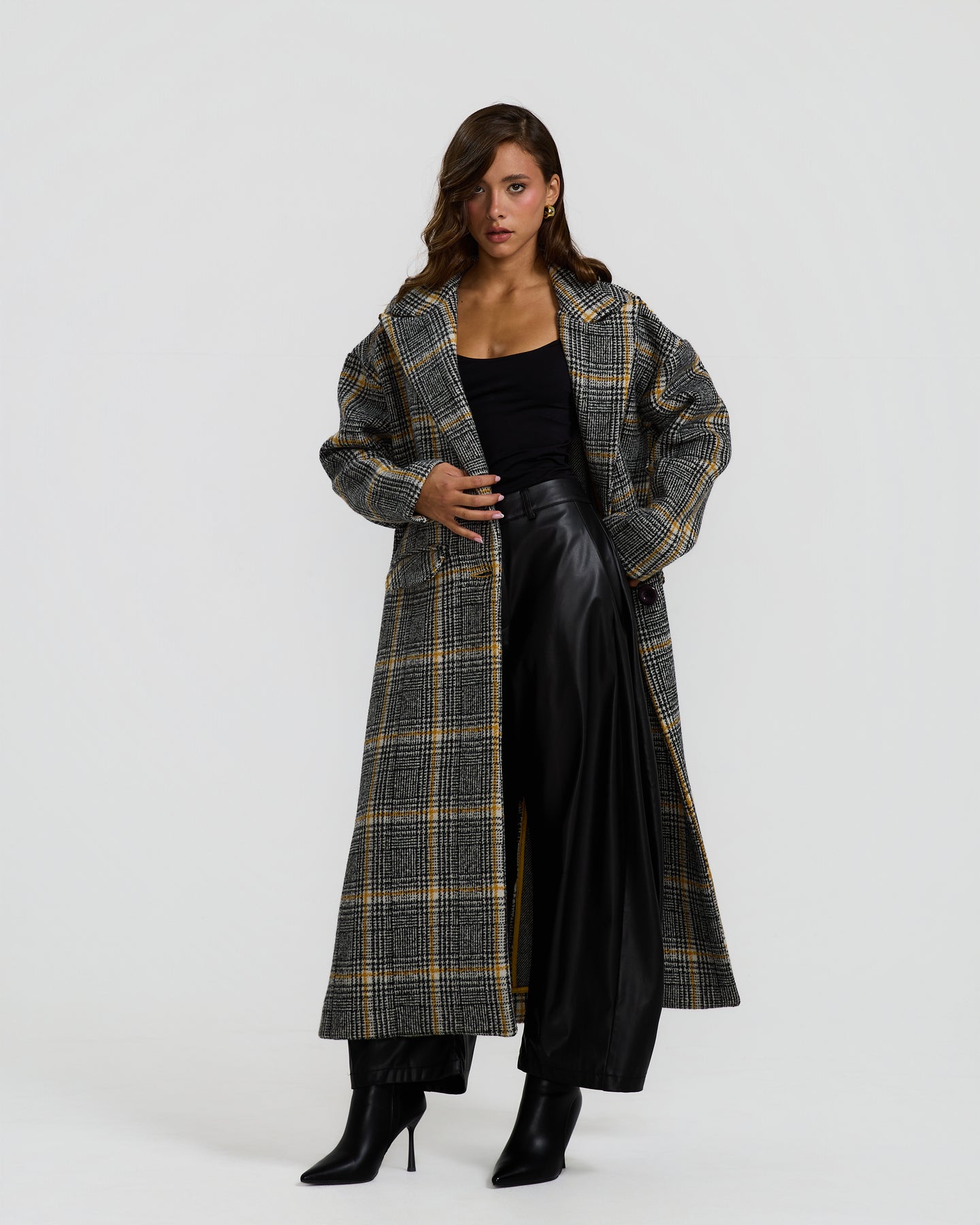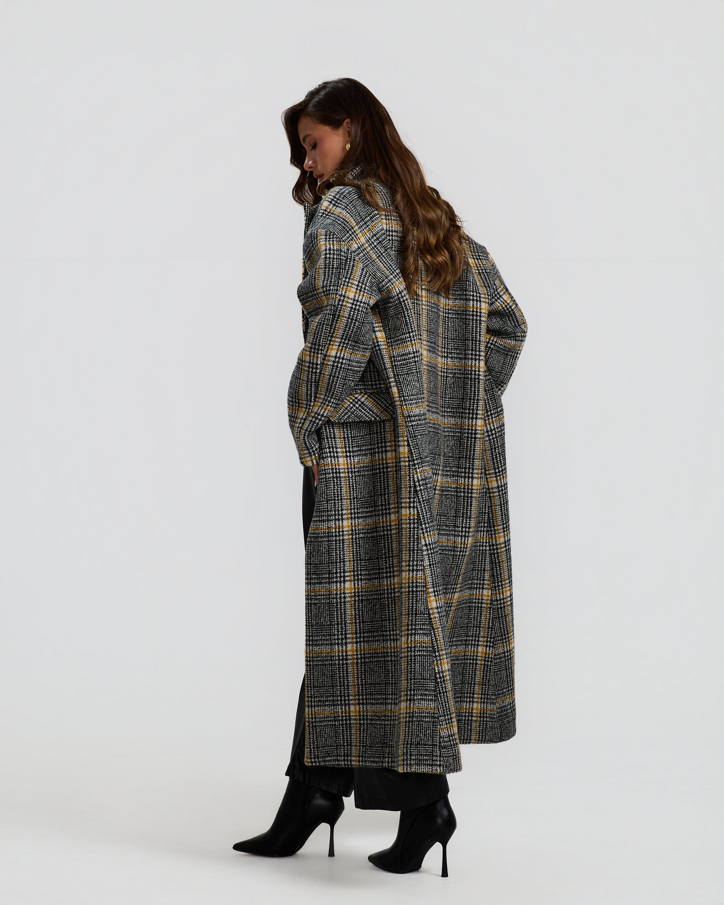 A long grey checked coat with a relaxed, tailored fit and subtle yellow lines, perfect for an easy, polished winter look.