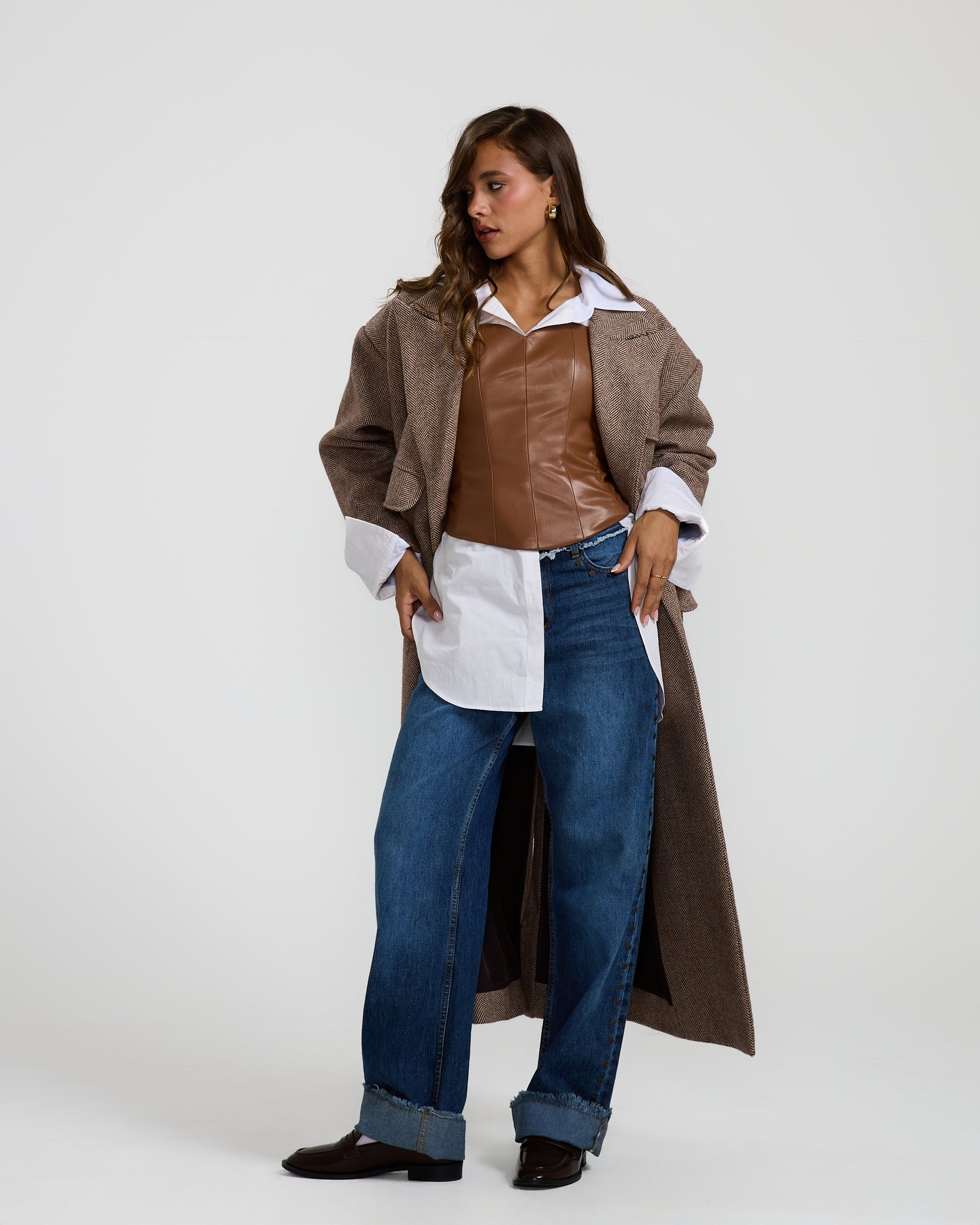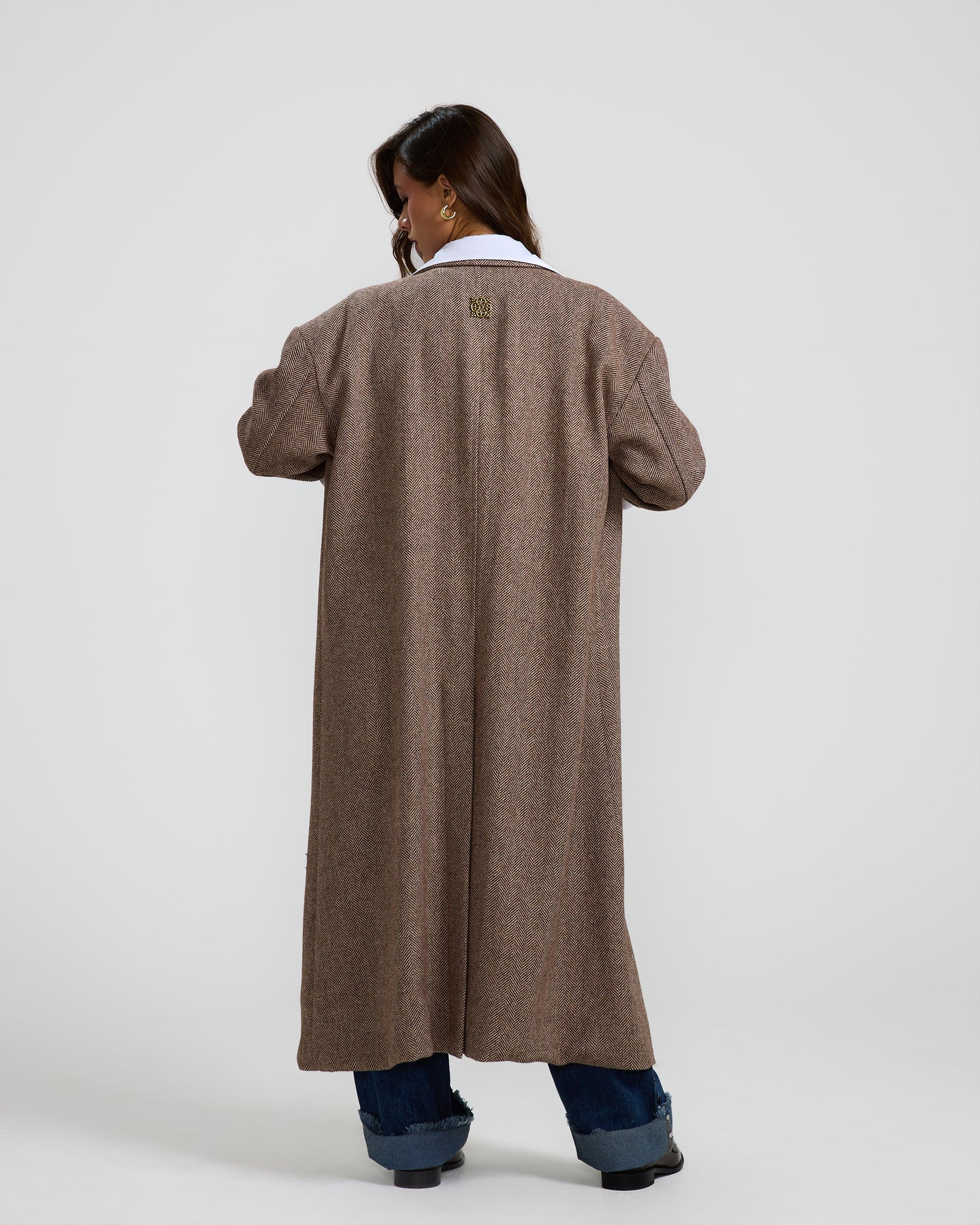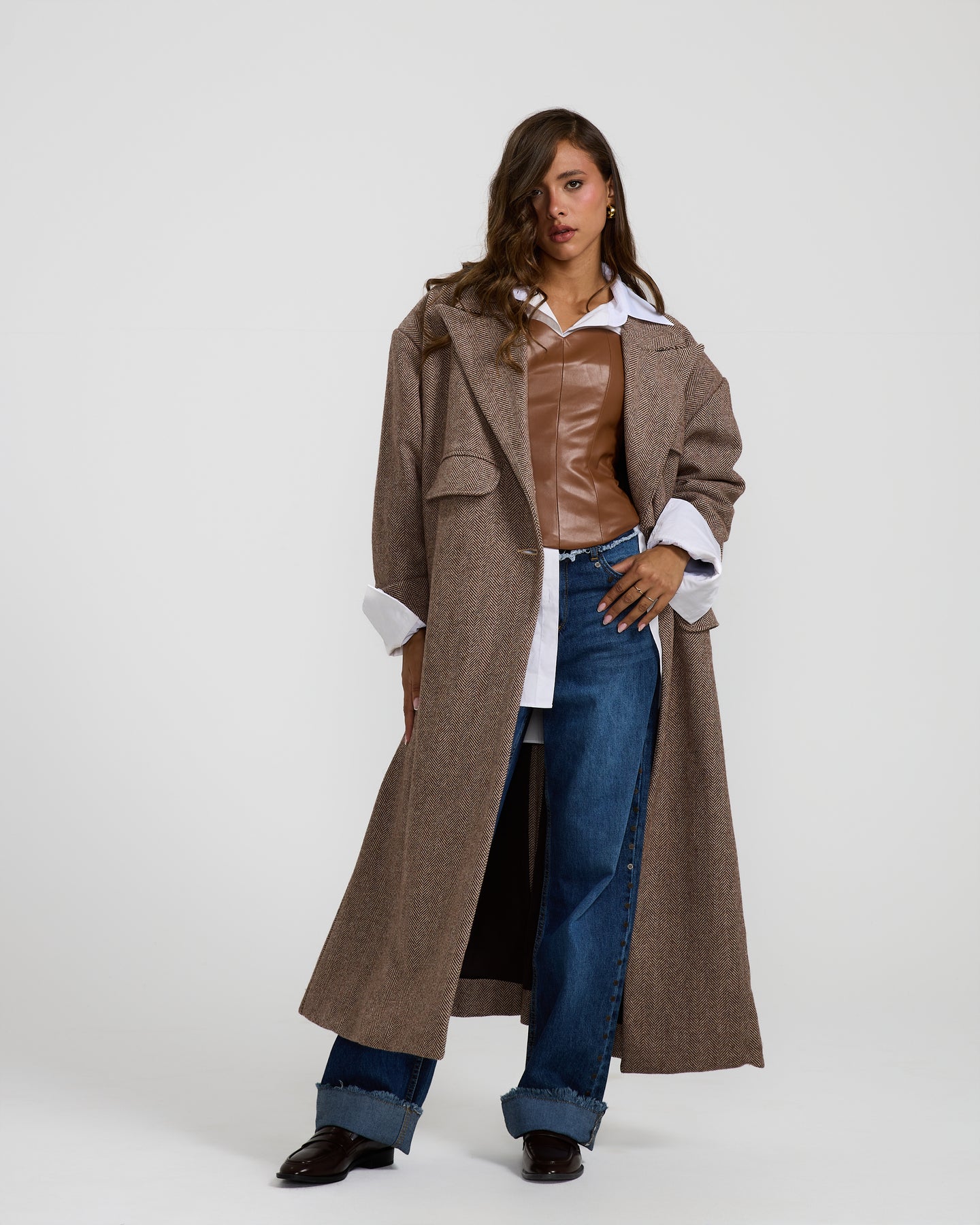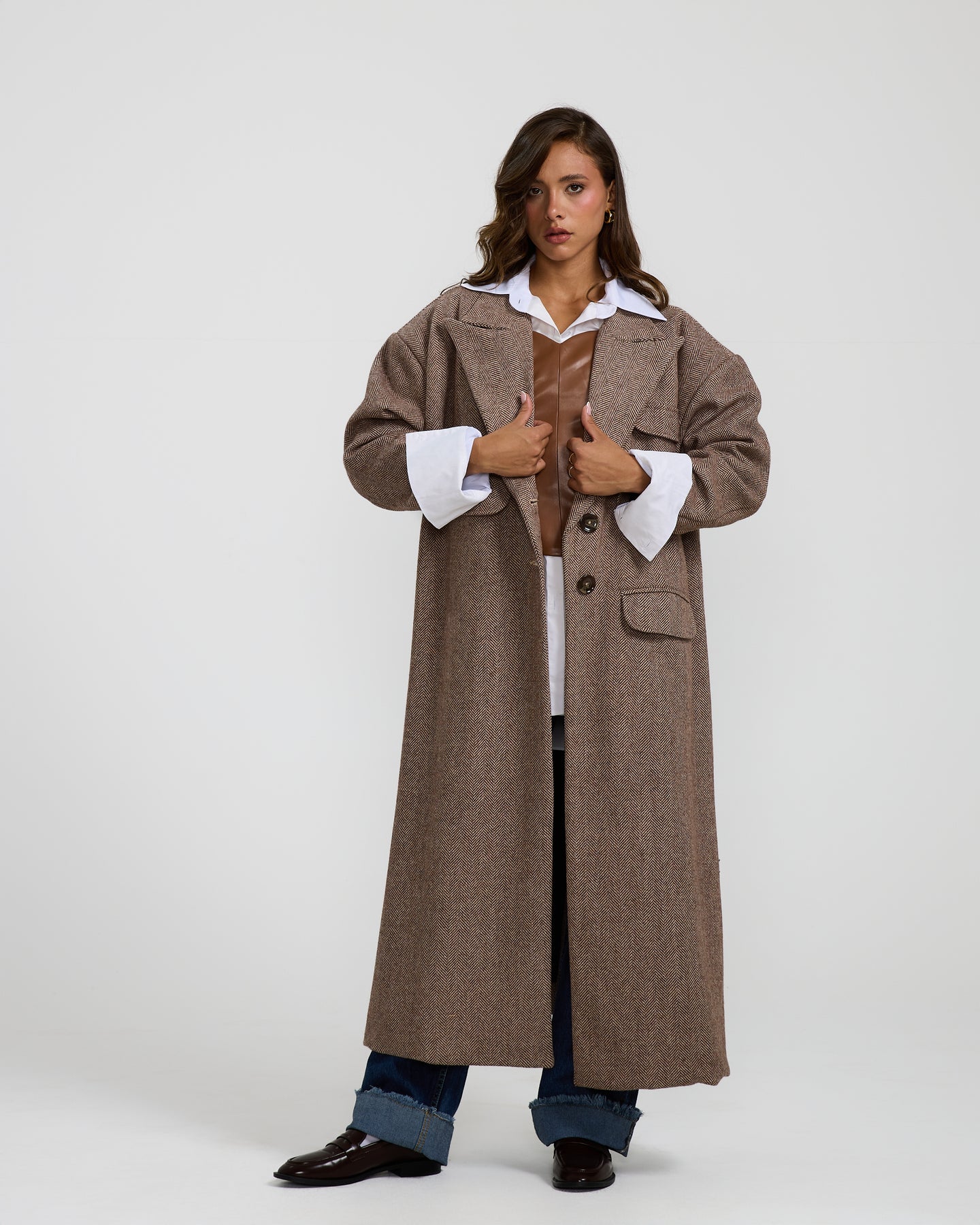 This oversized brown wool coat features a relaxed fit and soft structured feel, perfect for layering with effortless everyday style.