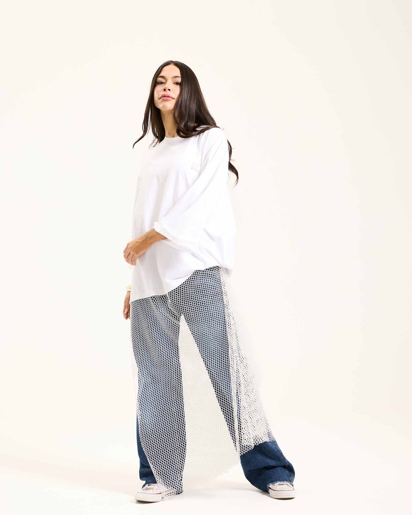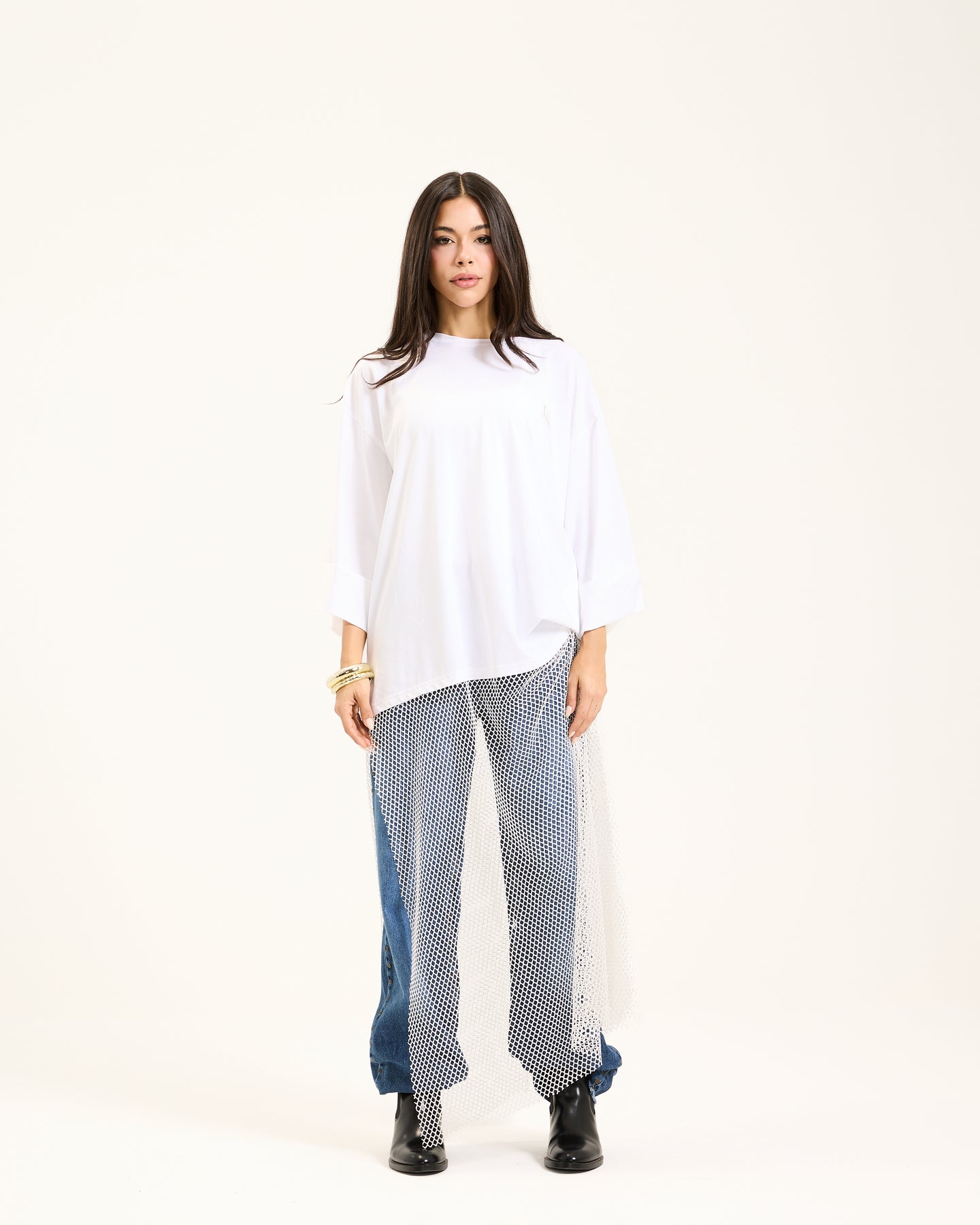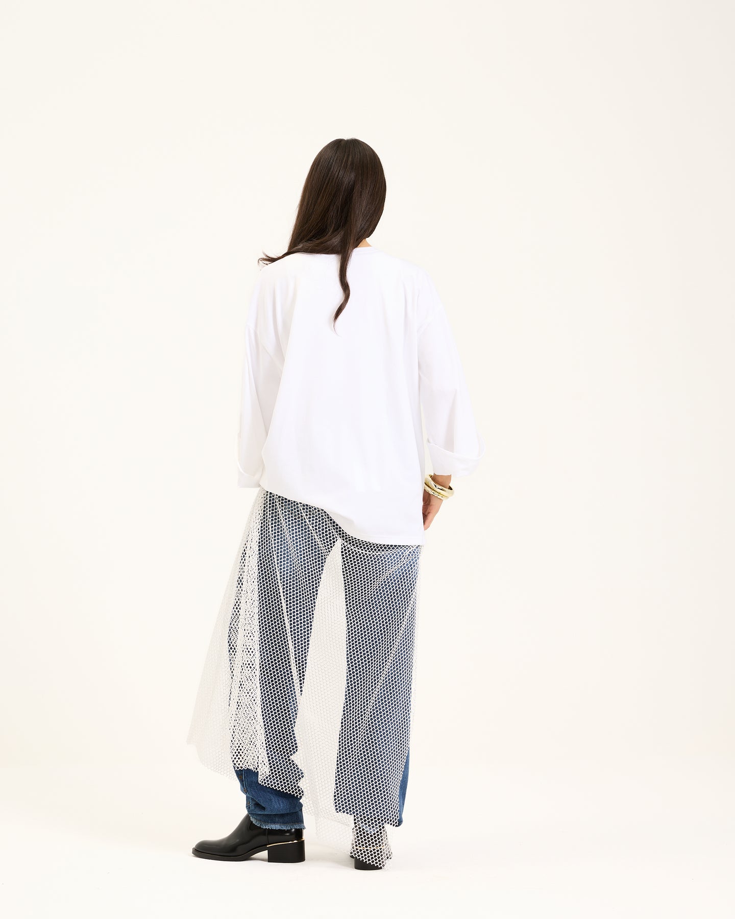 A relaxed white t-shirt with a flowing mesh panel that extends from the front and back, designed to be clipped inward for an effortlessly asymmetrical silhouette with modern edge.