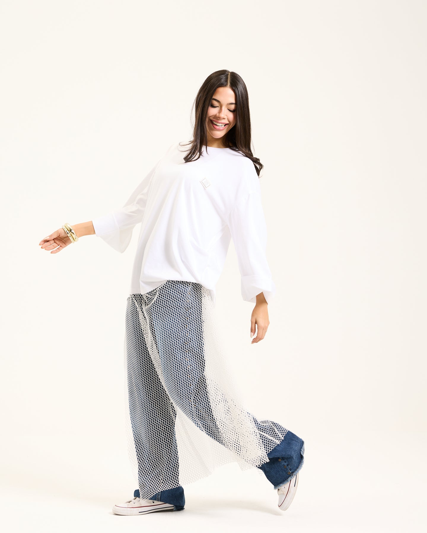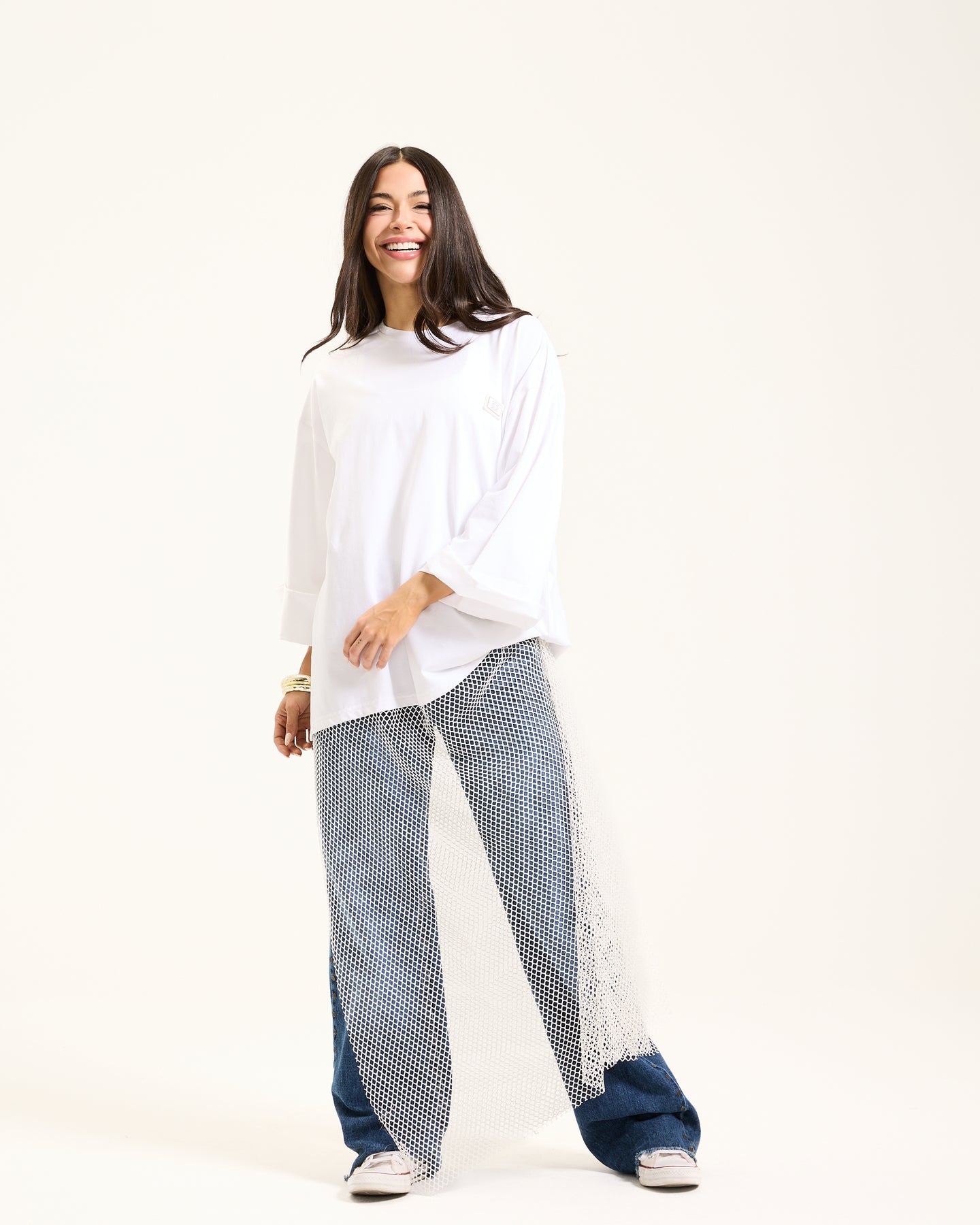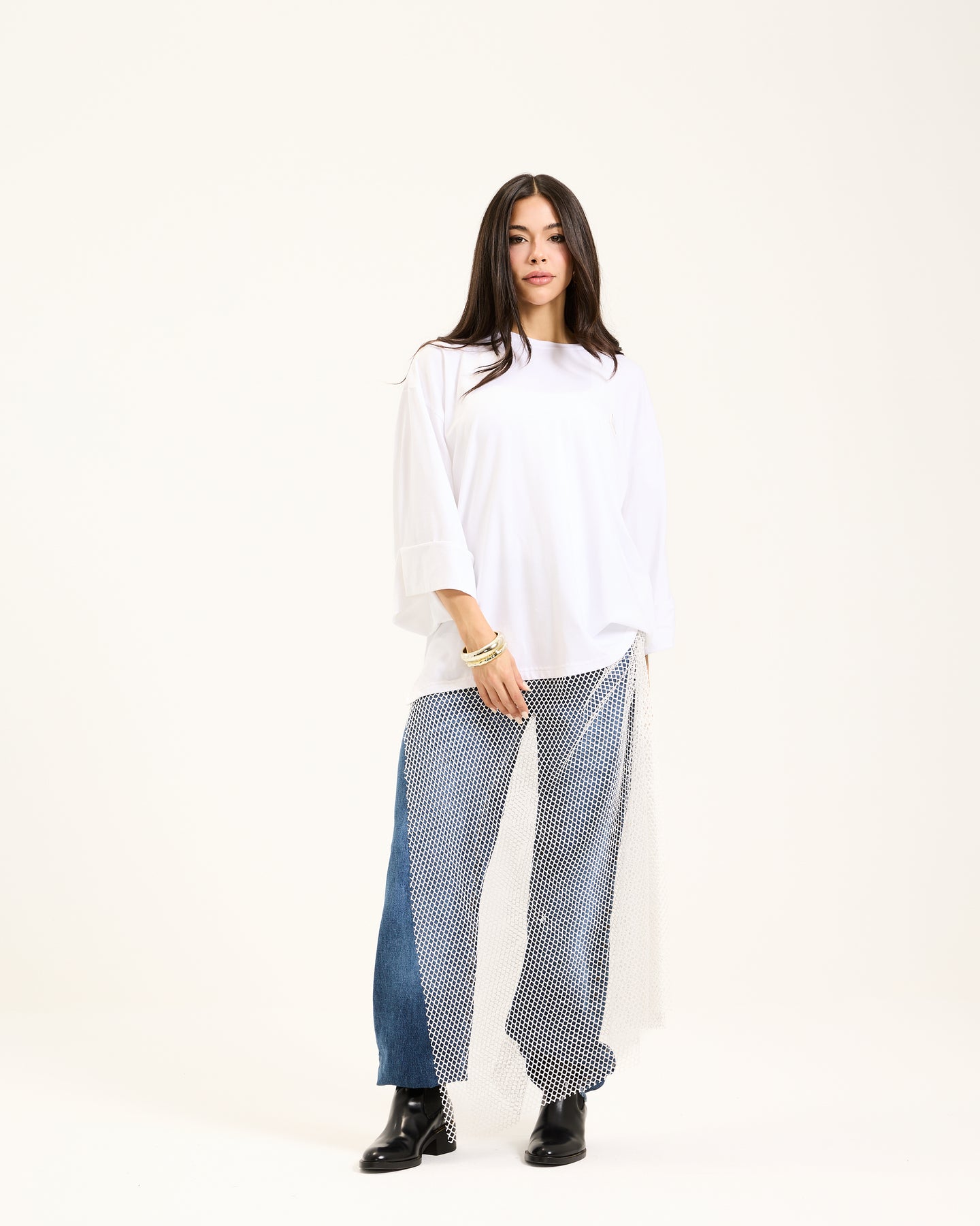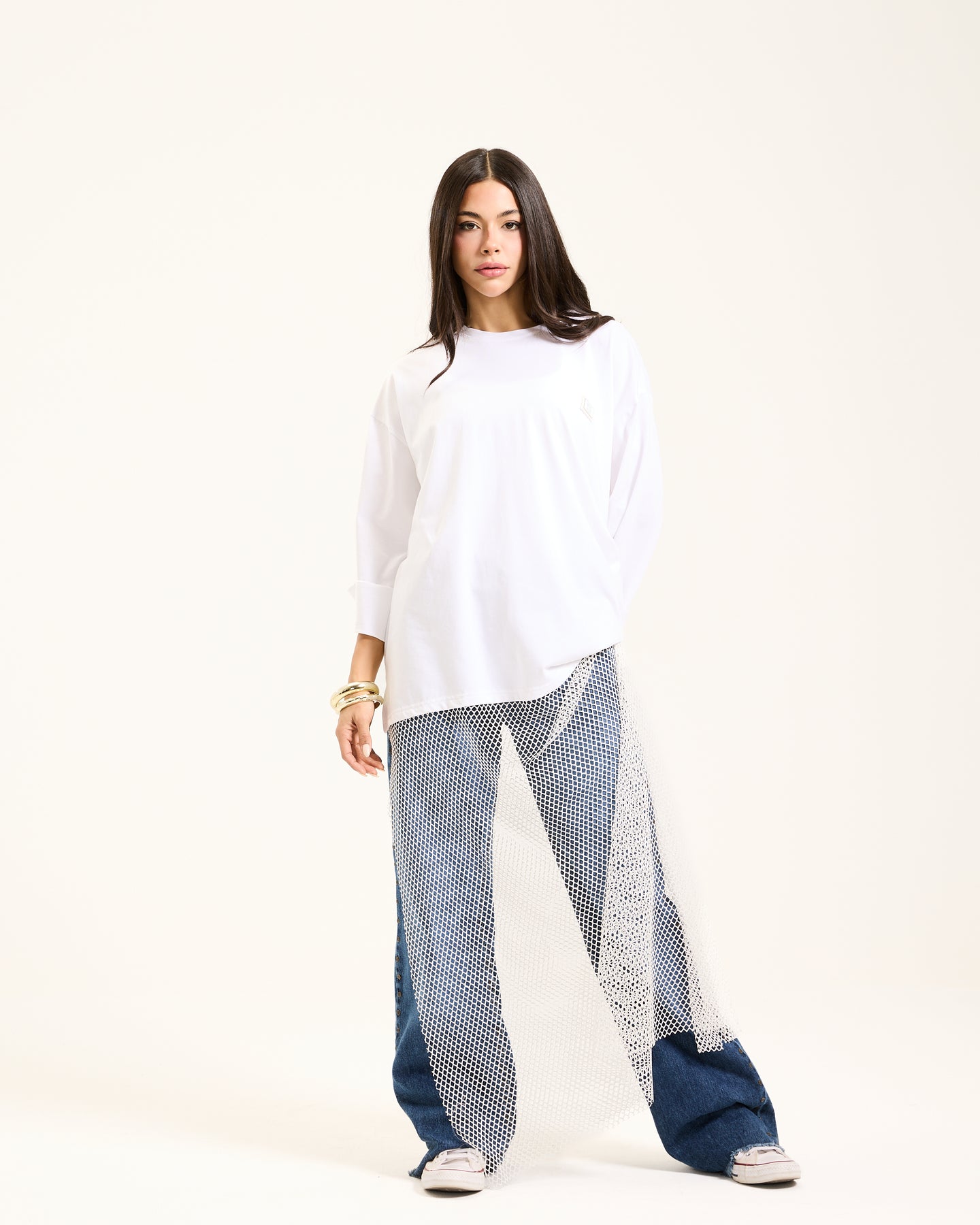 A relaxed white t-shirt with a flowing mesh panel that extends from the front and back, designed to be clipped inward for an effortlessly asymmetrical silhouette with modern edge.