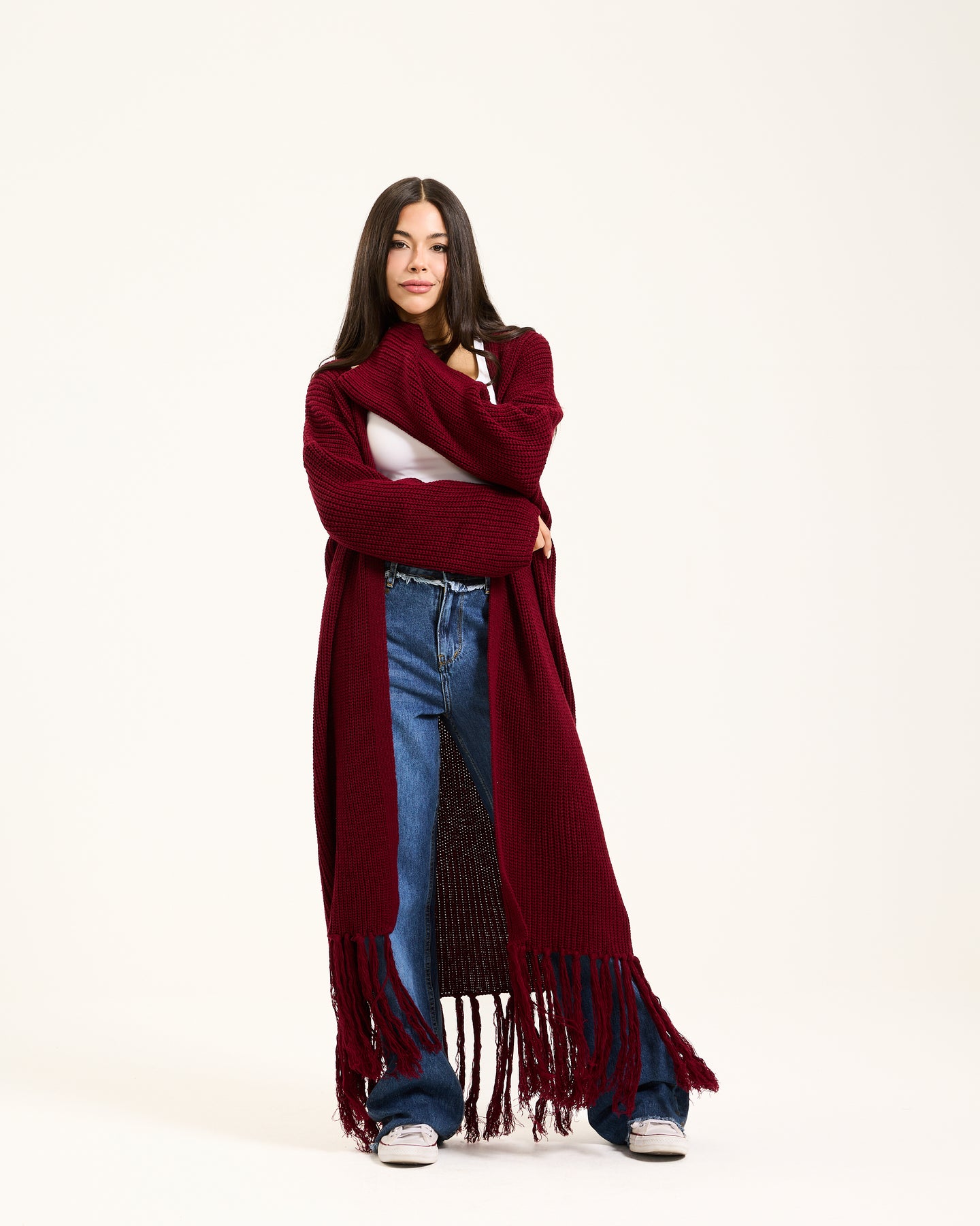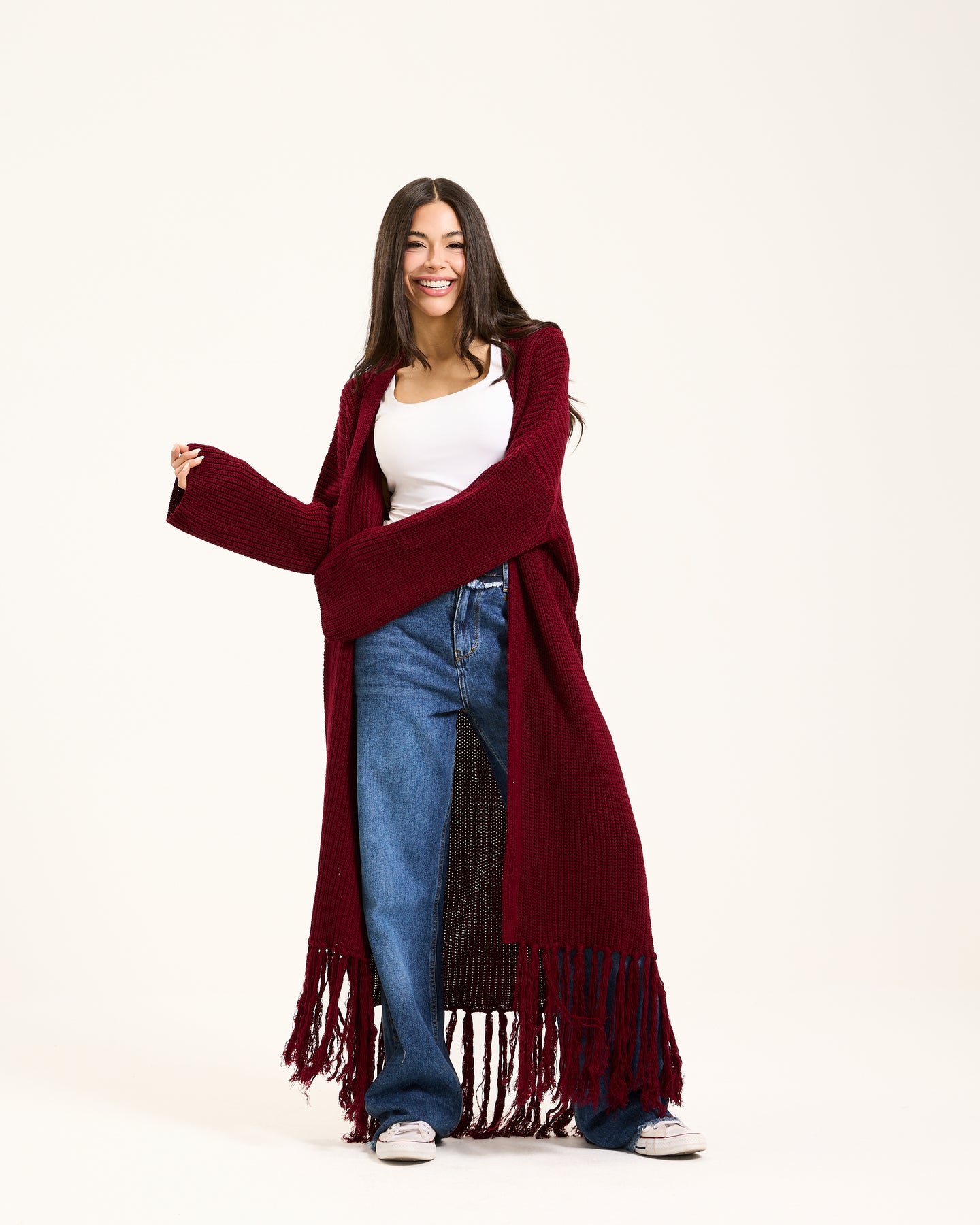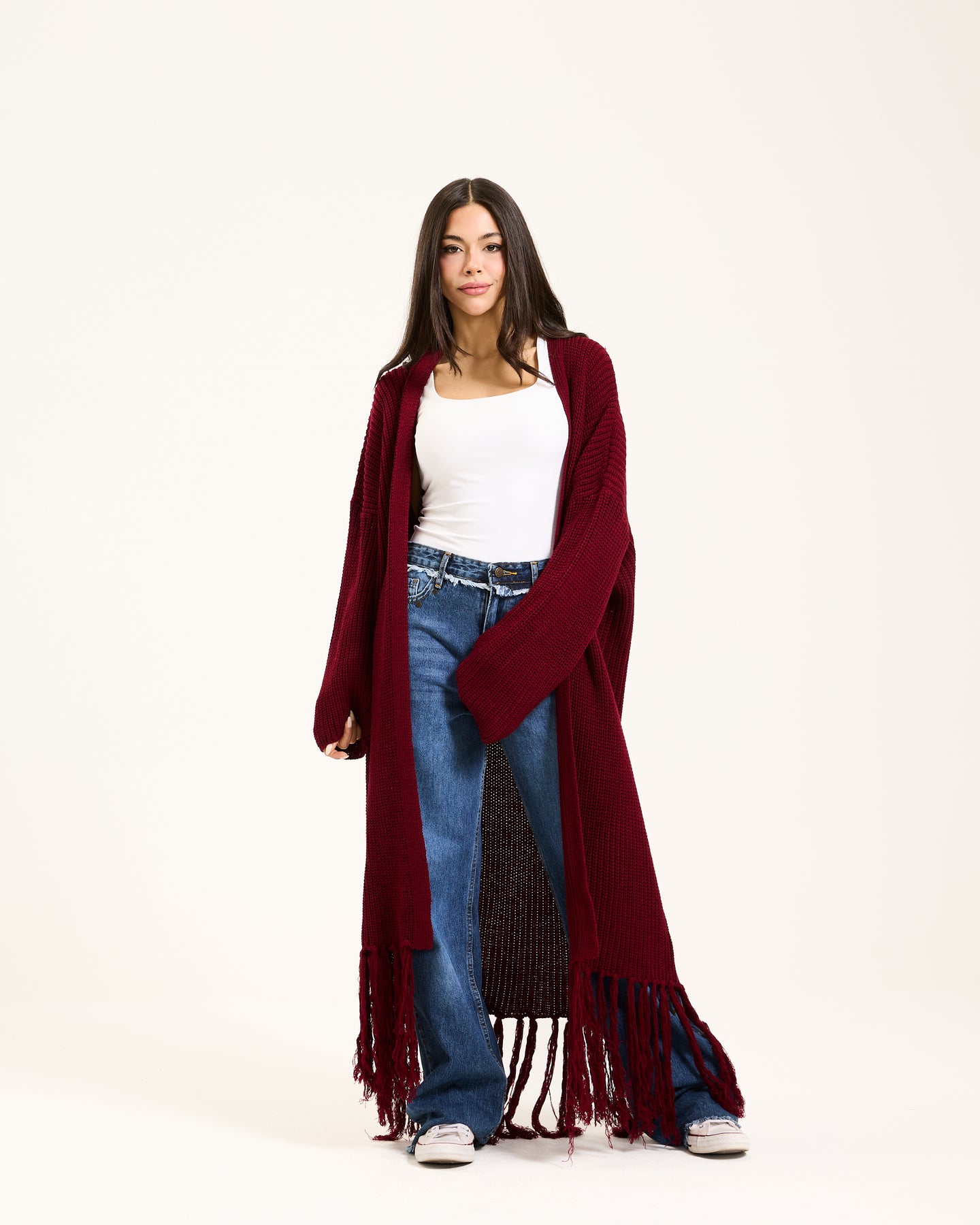 This cardigan is has a long design with a chunky knit texture for a cozy and relaxed feel. The hem is adorned with fringed tassels, adding a subtle bohemian touch.