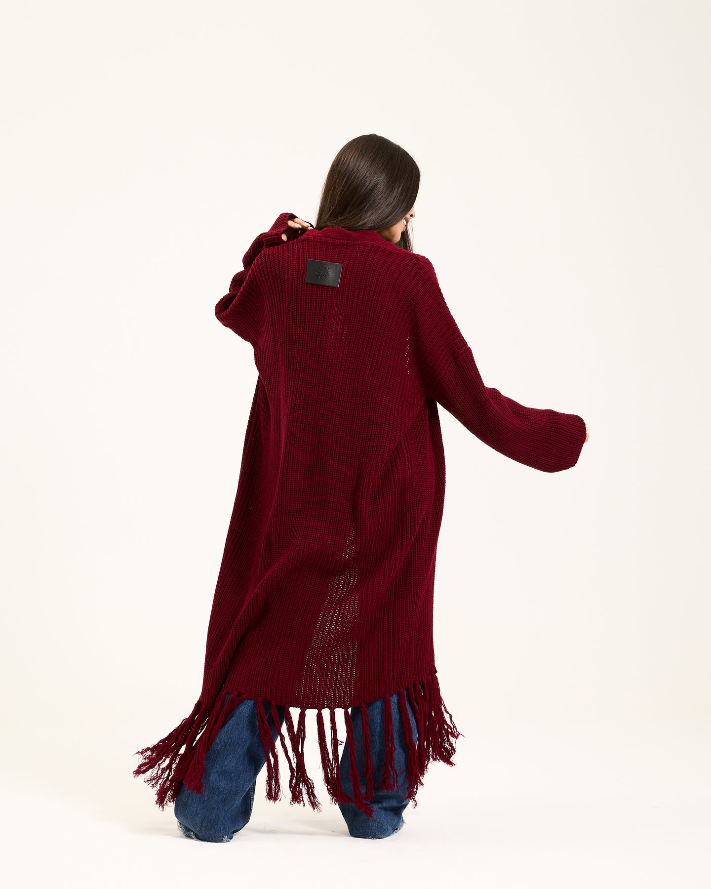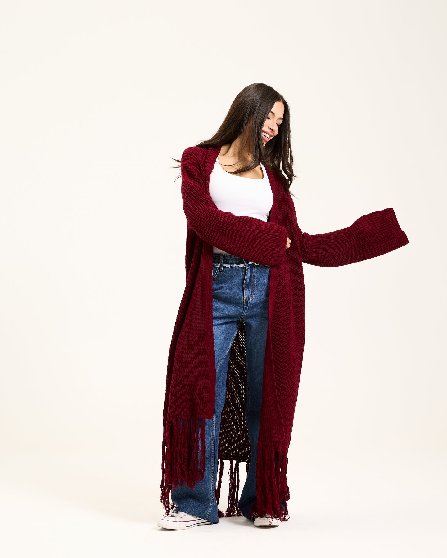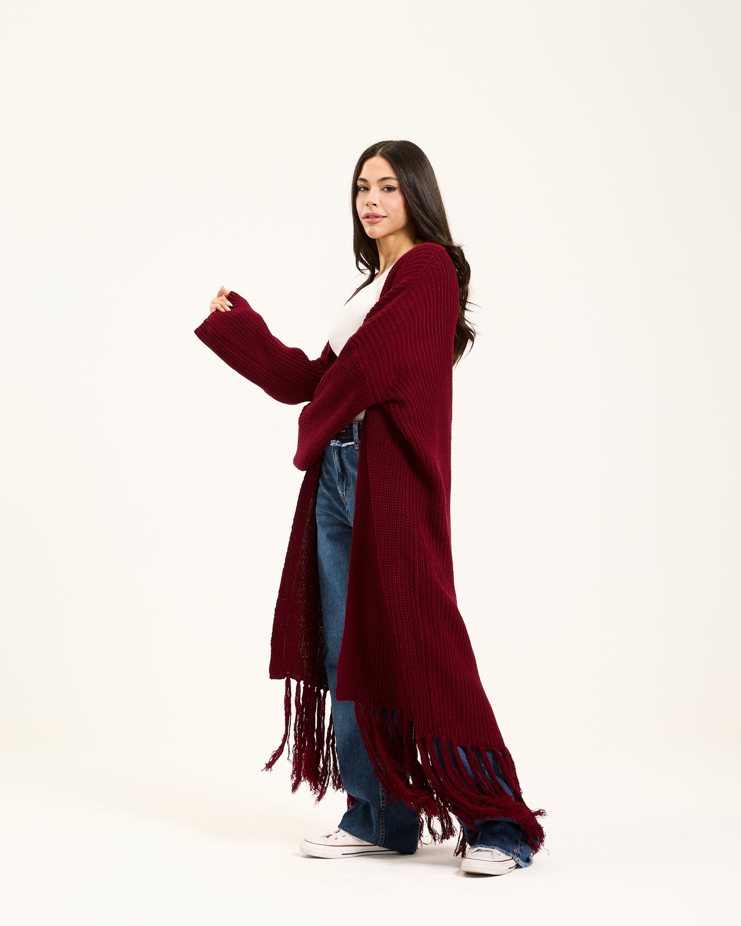 Maxi Hem Fringes Cardigan In Burgundy