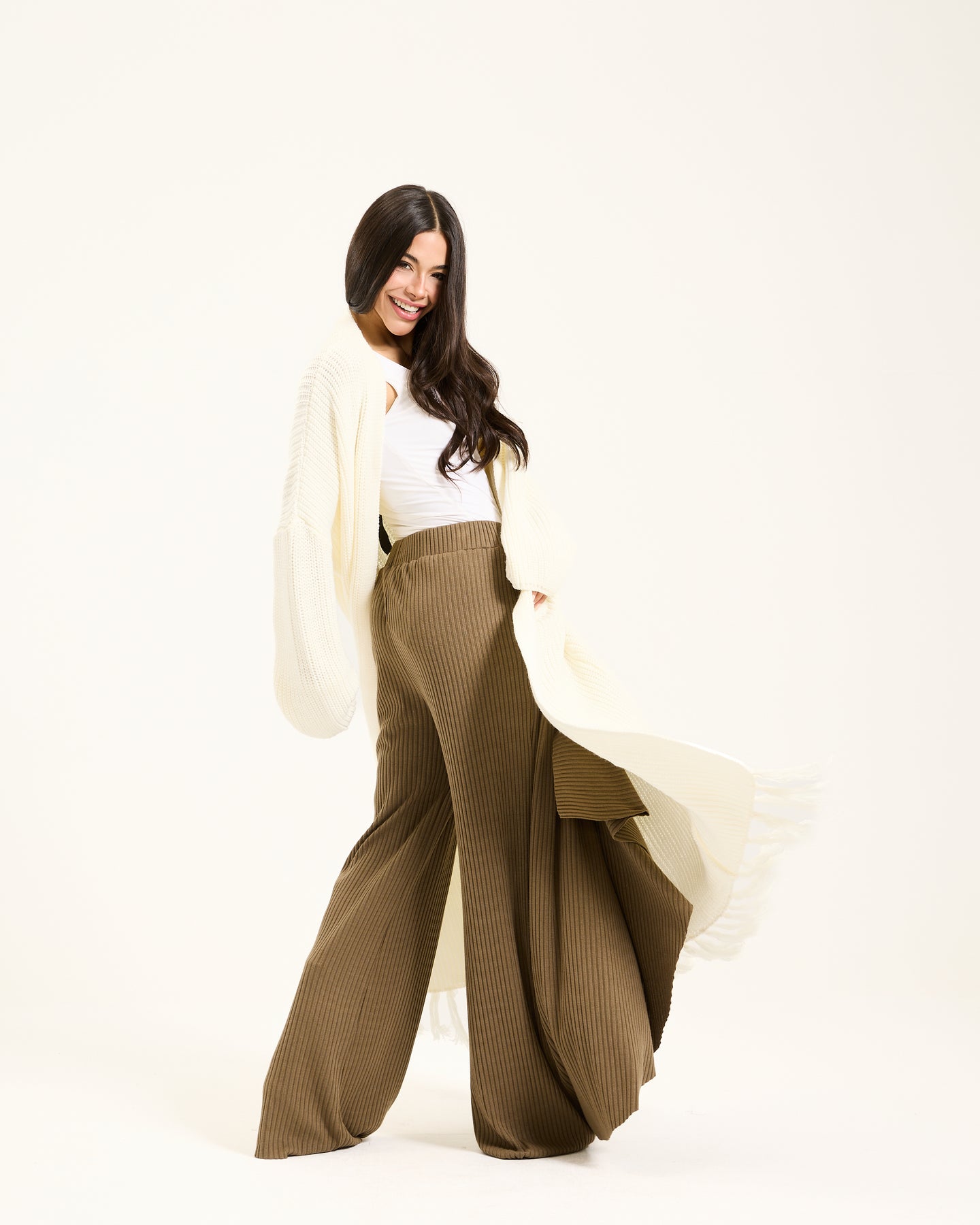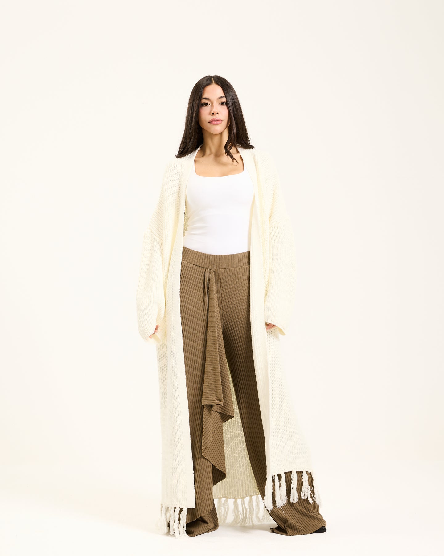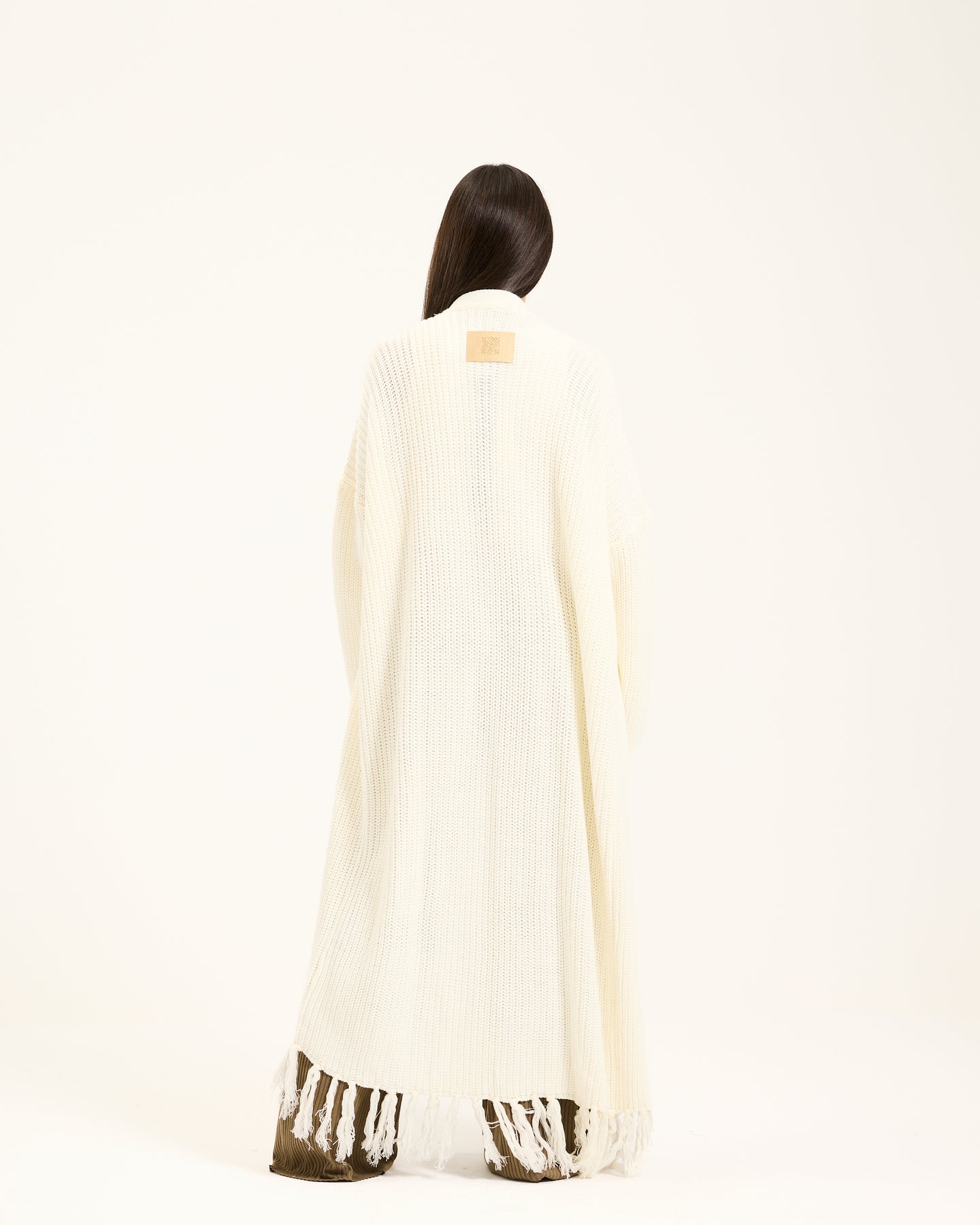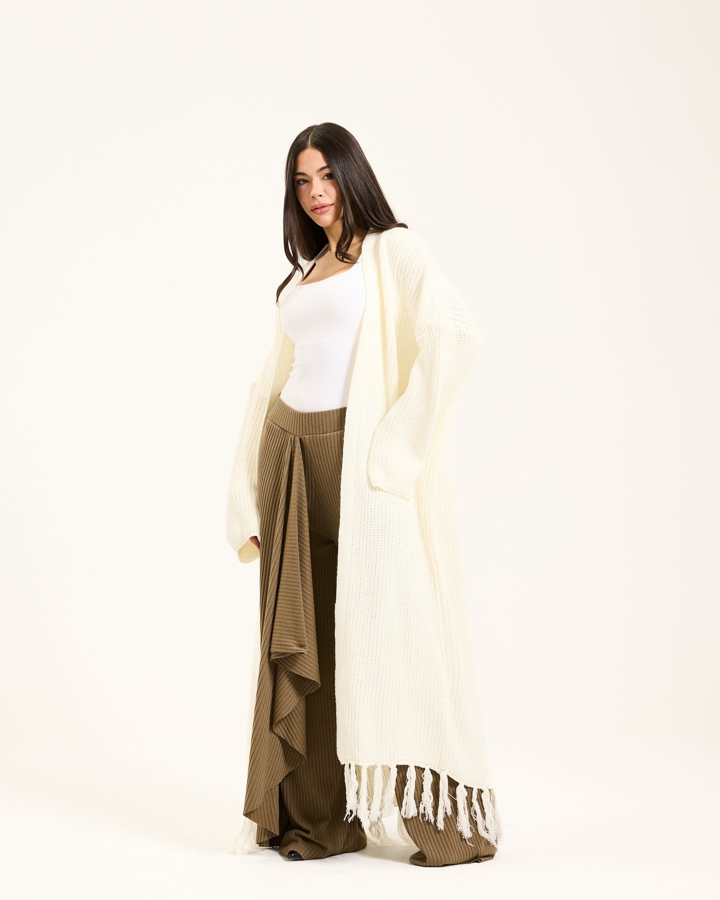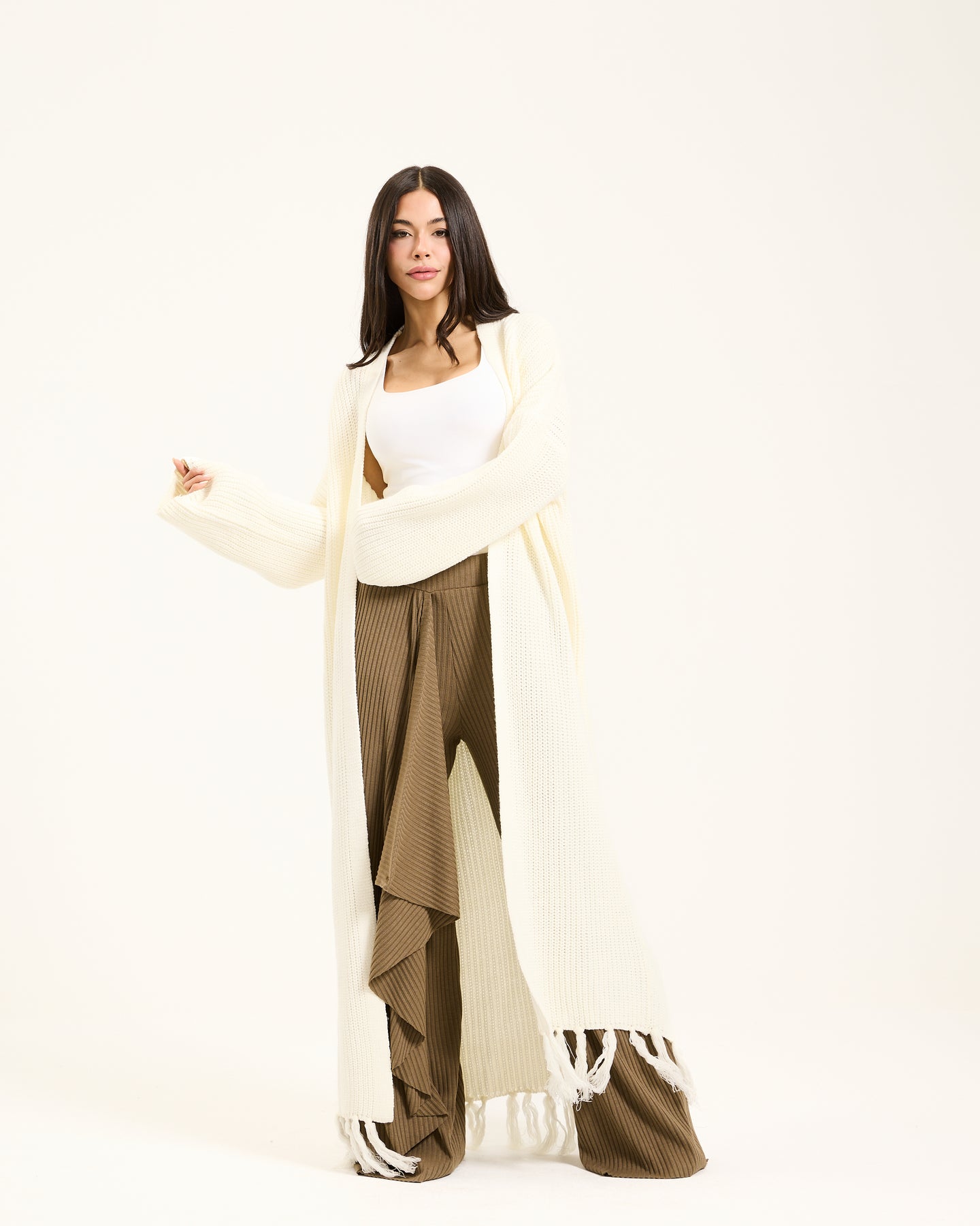 This cardigan is has a long design with a chunky knit texture for a cozy and relaxed feel. The hem is adorned with fringed tassels, adding a subtle bohemian touch.