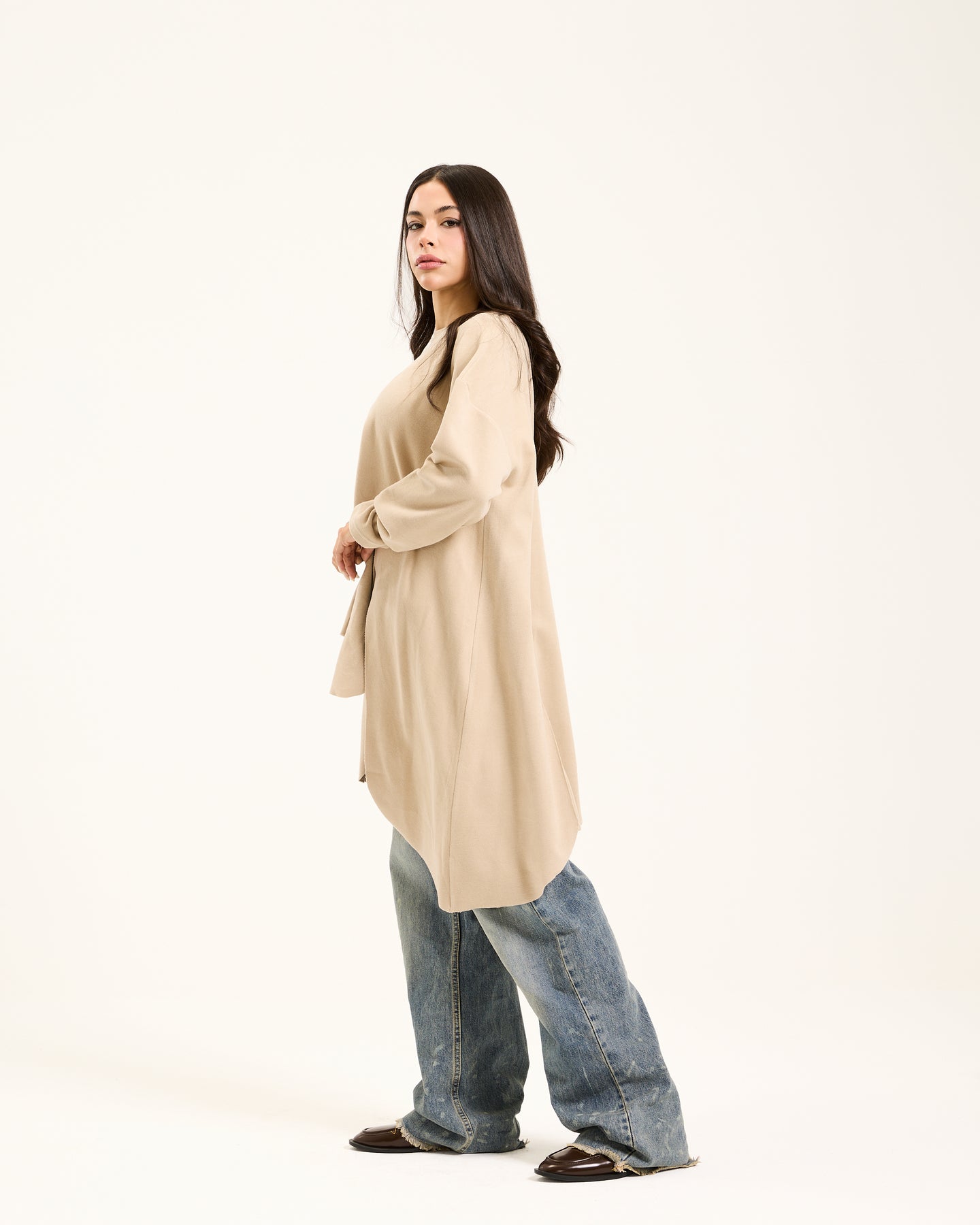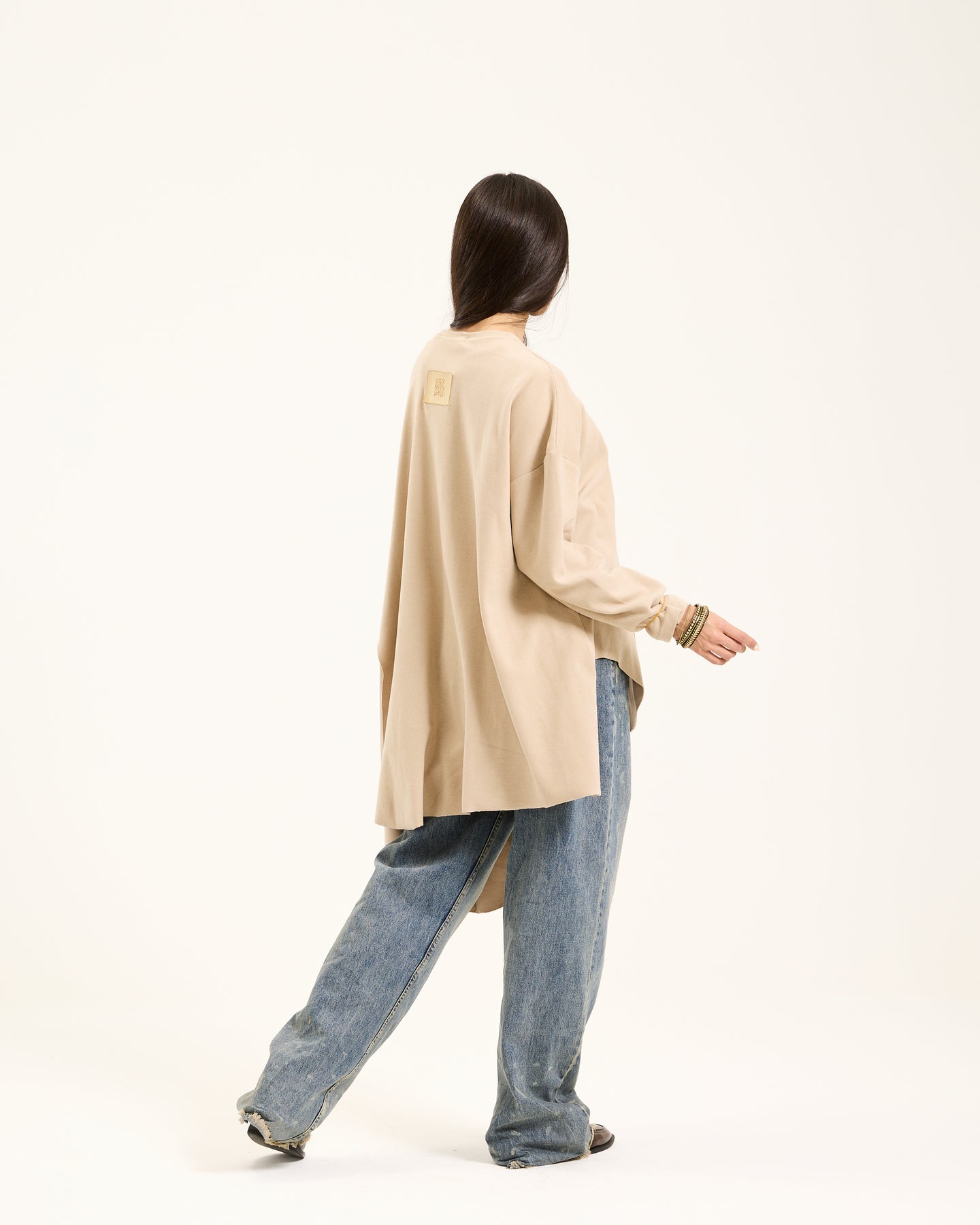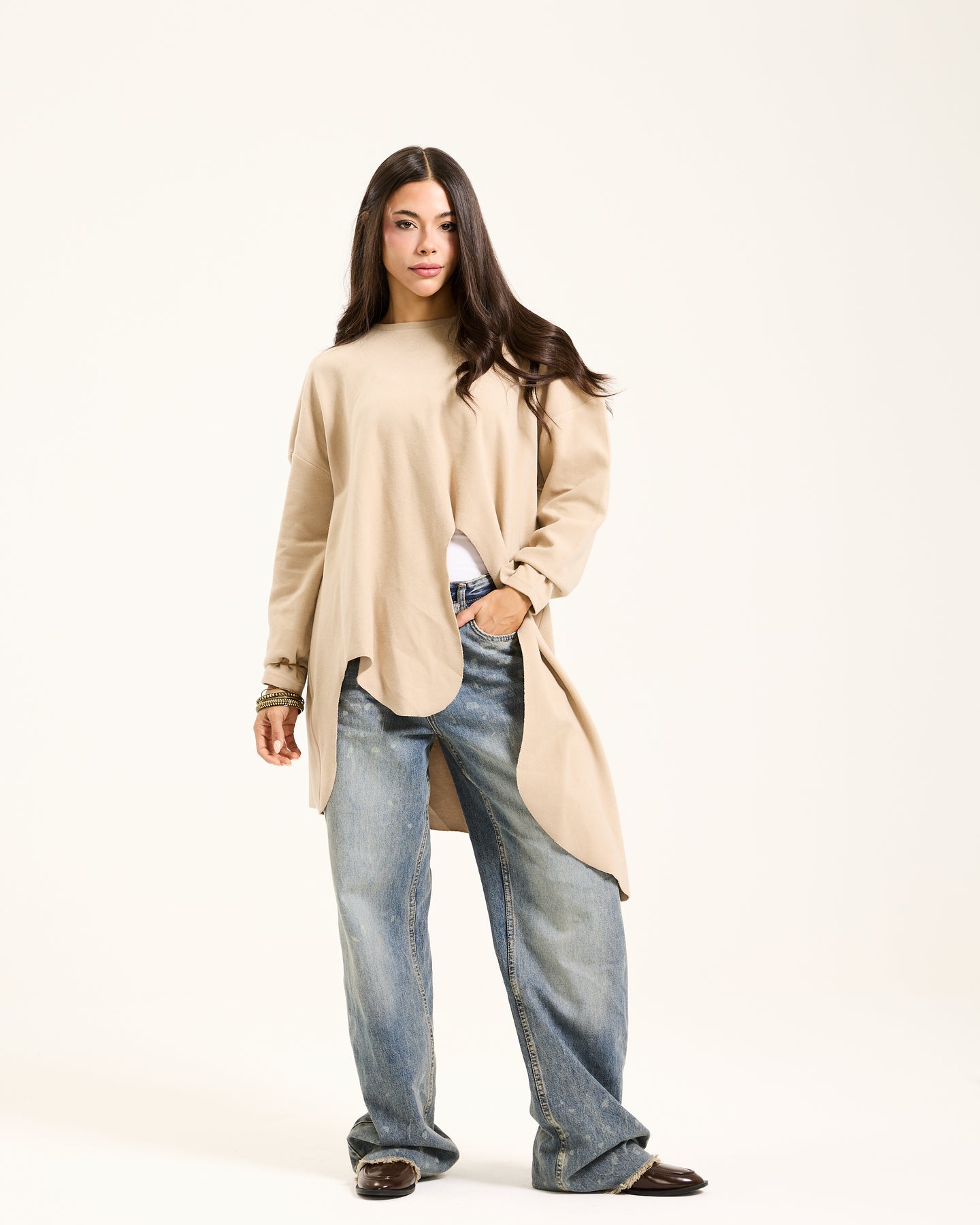 This oversized top is minimalistic yet has a twist to it. It is asymmetrical and features wave like cuts at the bottom