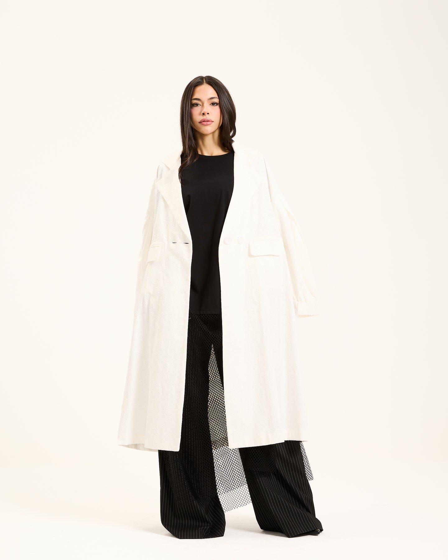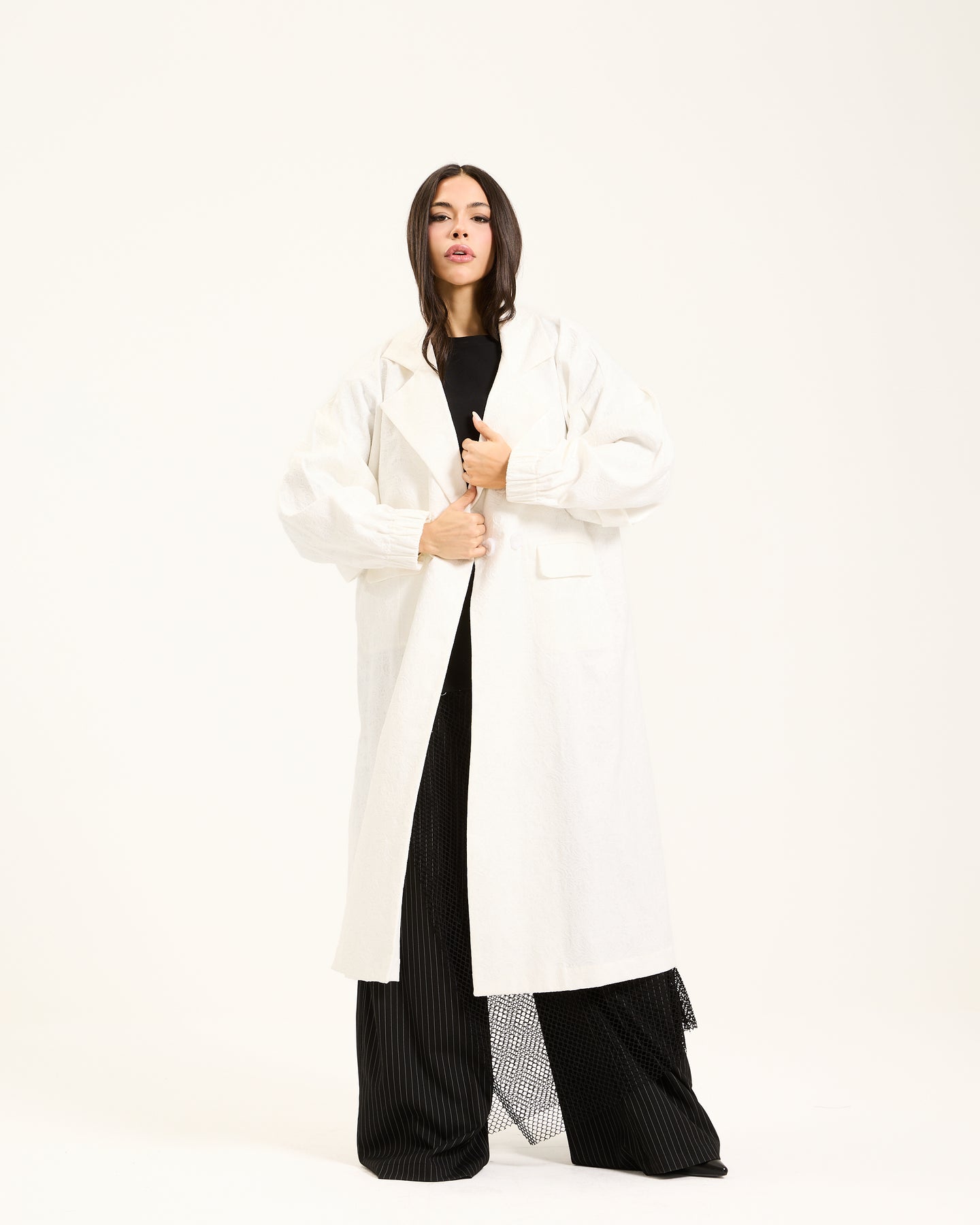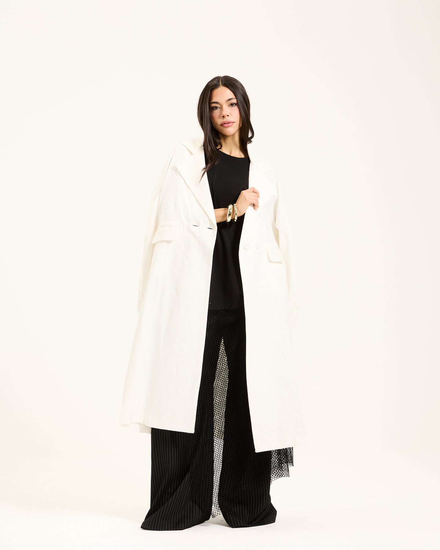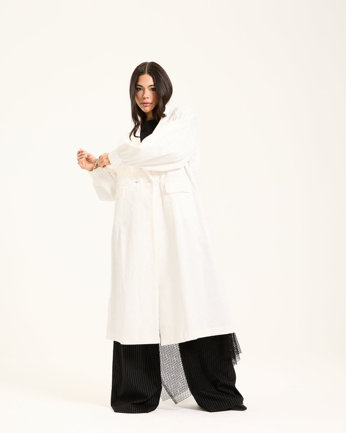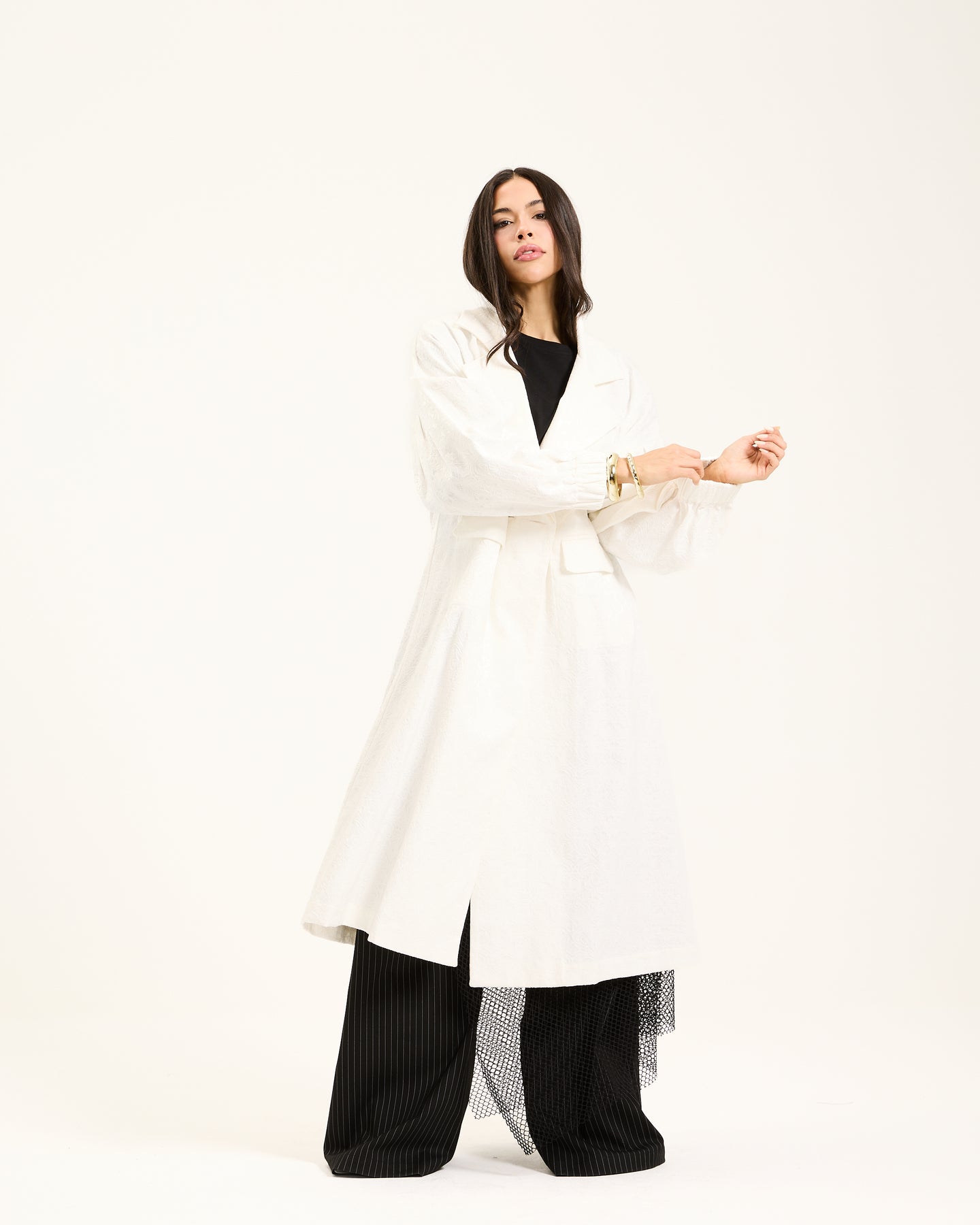 This coat combines timeless elegance and contemporary design. It has a subtle pattern of the same color, adding refined texture to the classic black silhouette. The puffy sleeves elevate the piece with a boldness to the look.