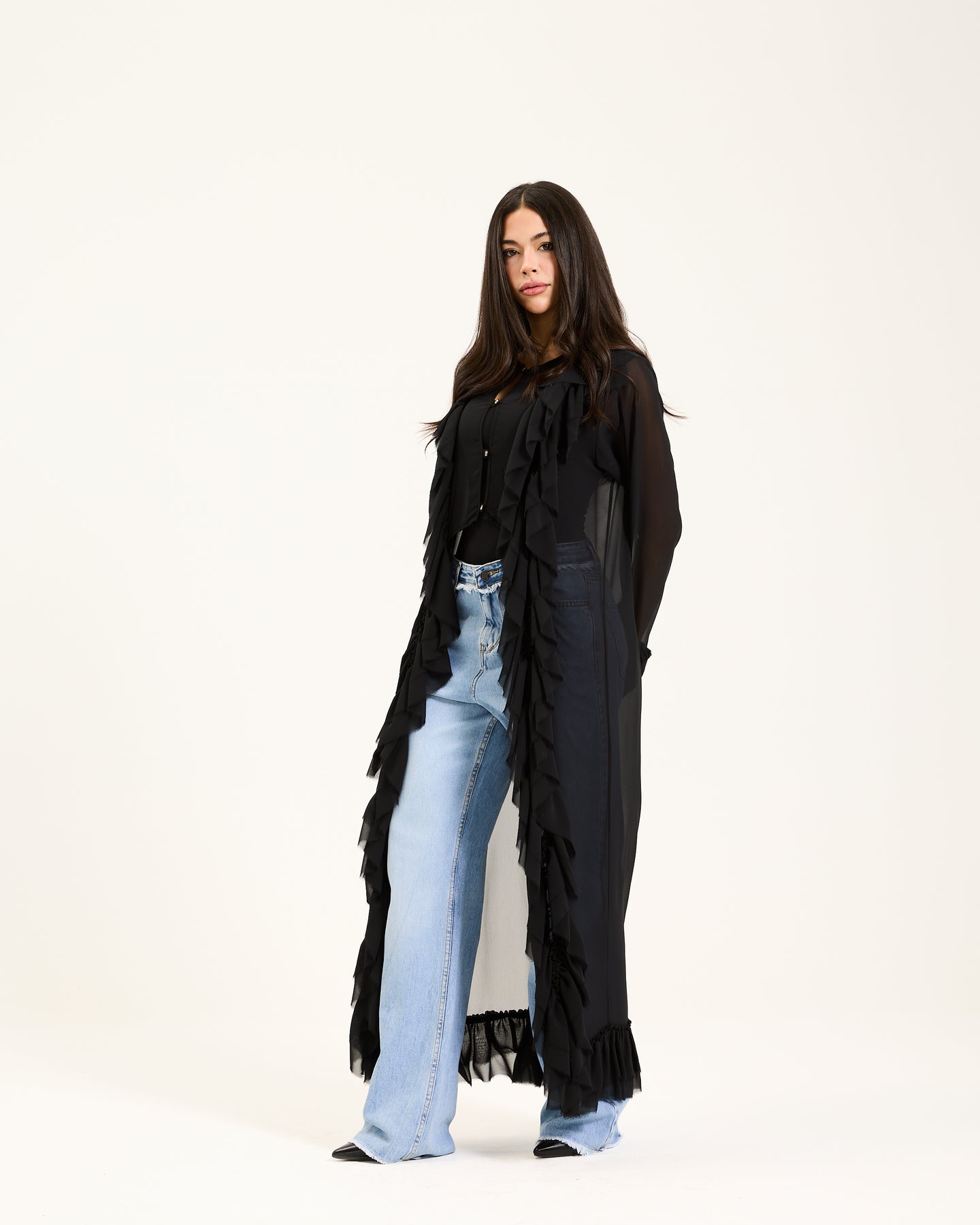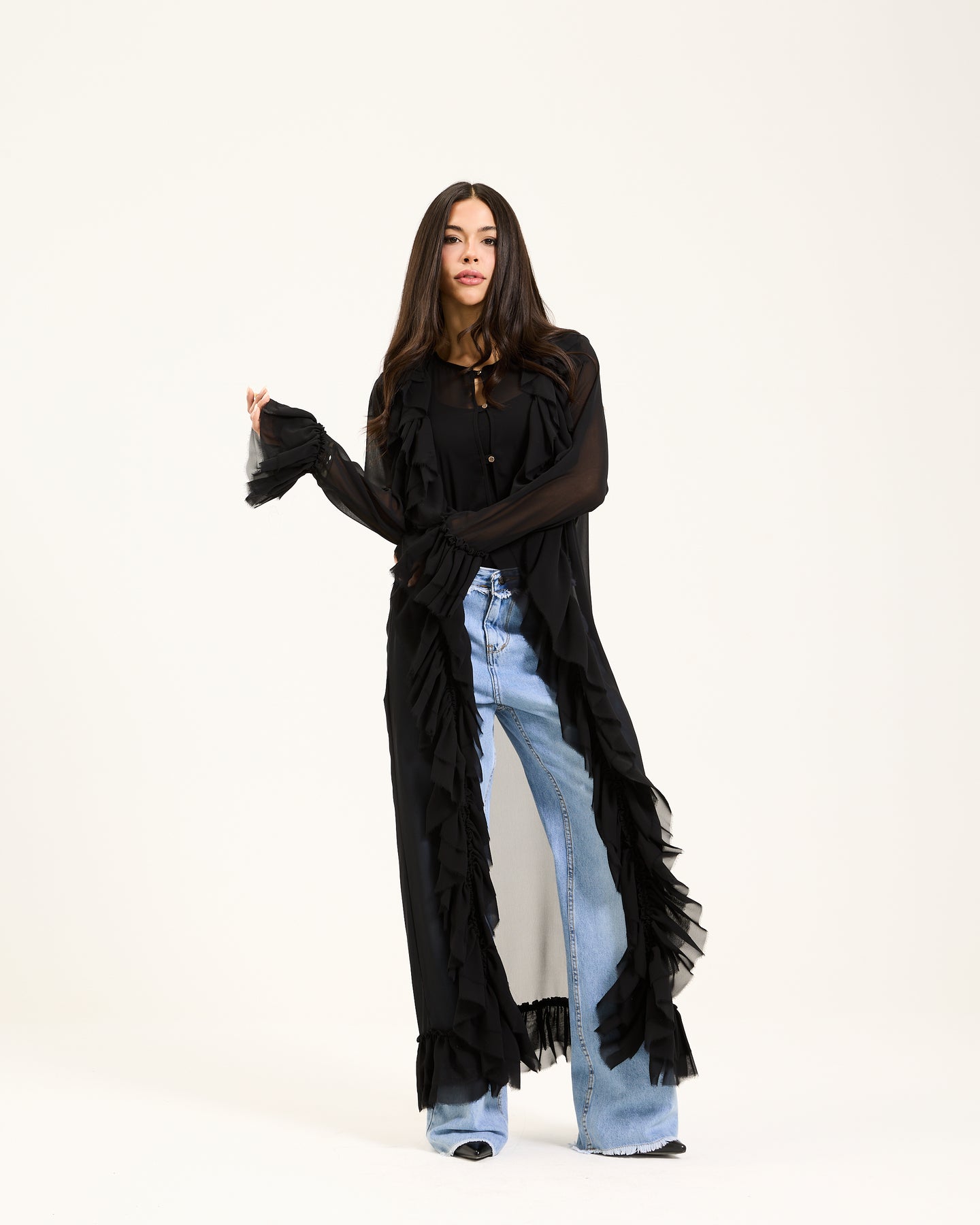 A statement black ruffle maxi chiffon top featuring cascading layered details and a lightweight sheer finish for dramatic, flowy elegance.
