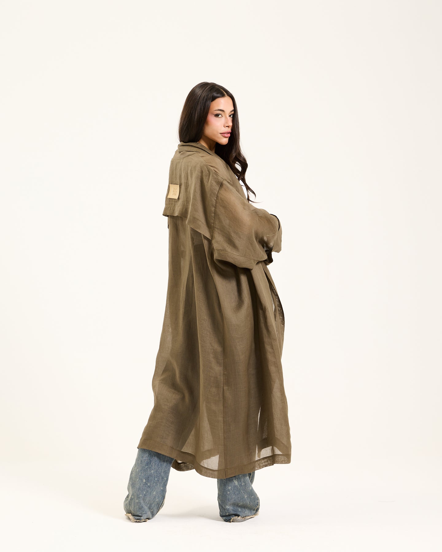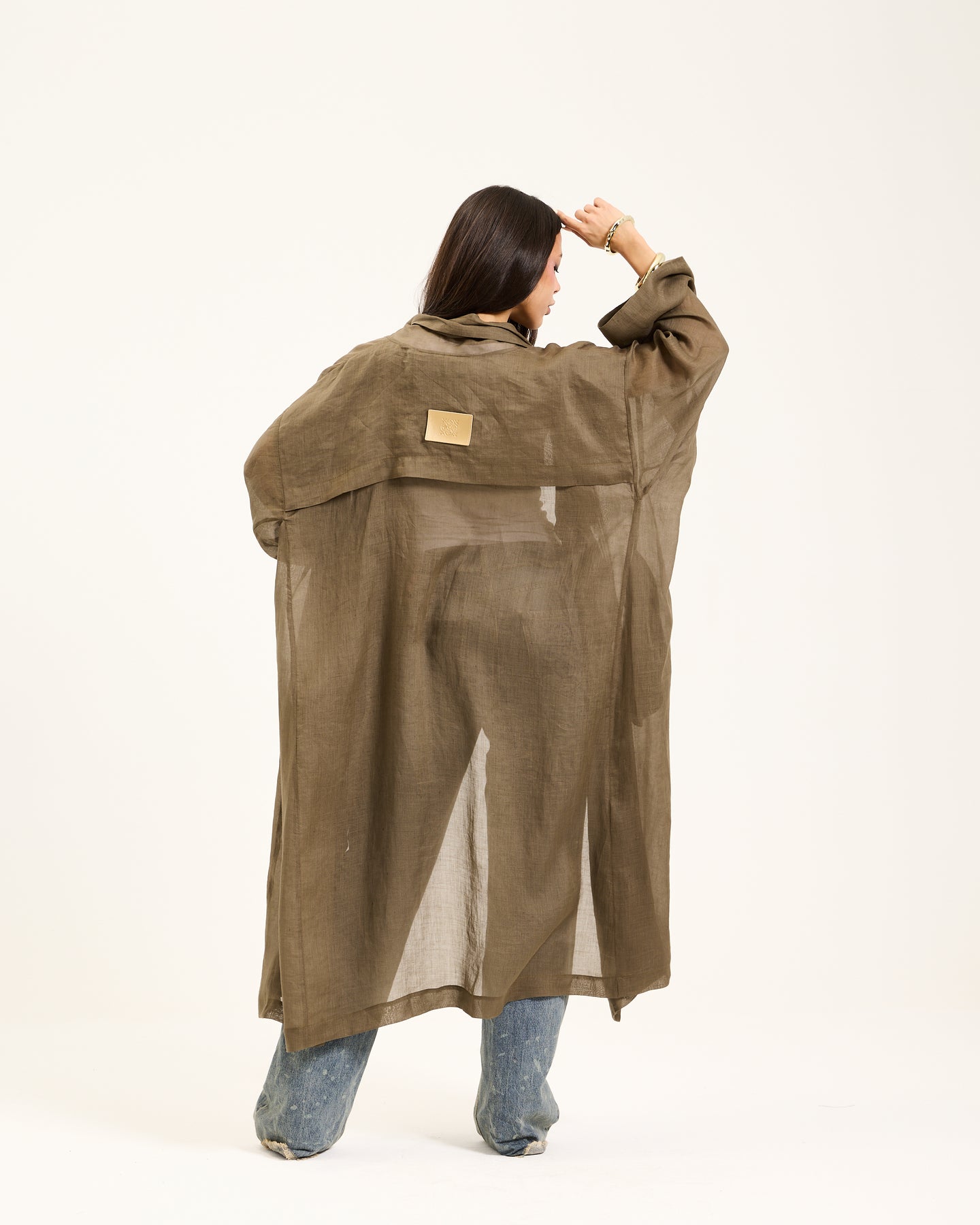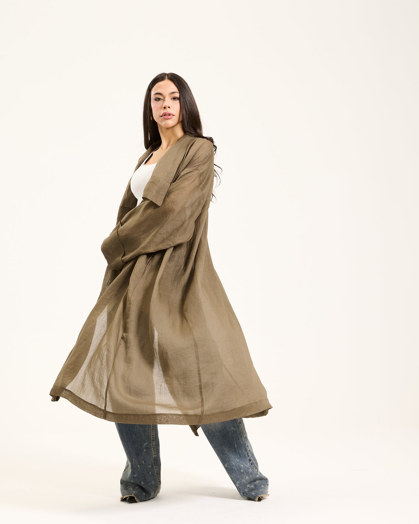 A lightweight sheer linen olive cardigan with a flowy open-front design, adding effortless movement and layering elegance to any look.
