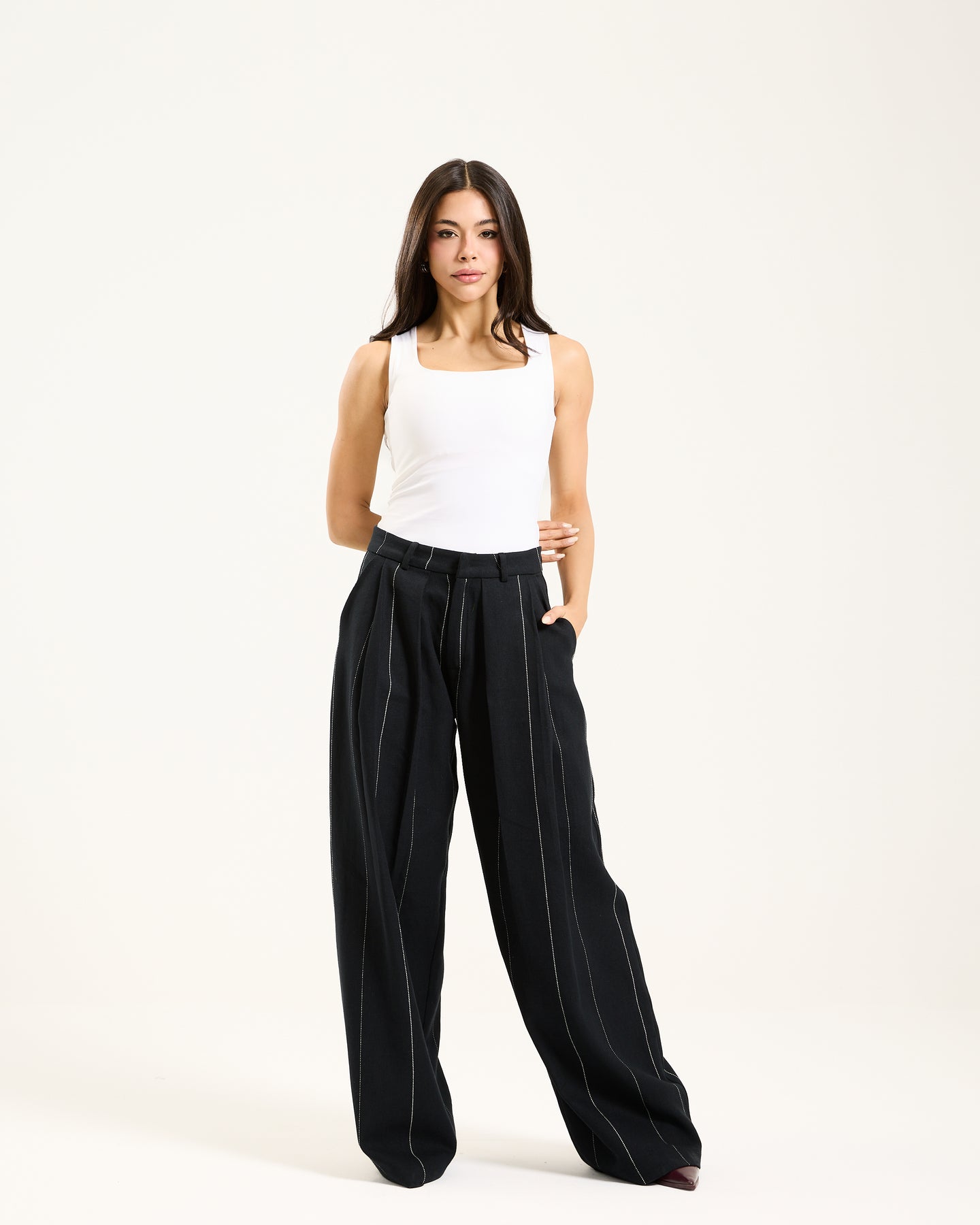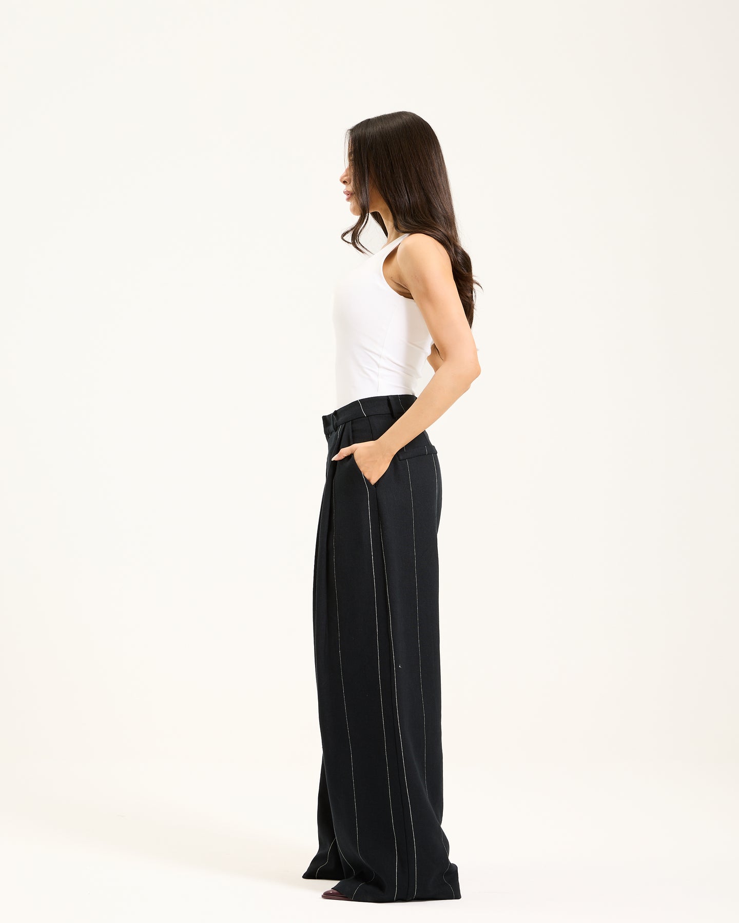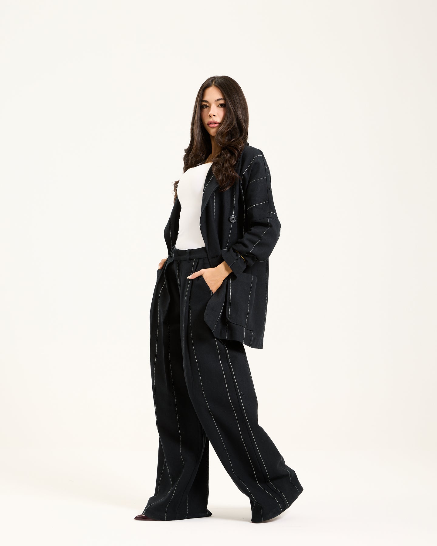 Striped black linen pants with the perfect wide-leg fit, offering breathable comfort and effortless tailored elegance.