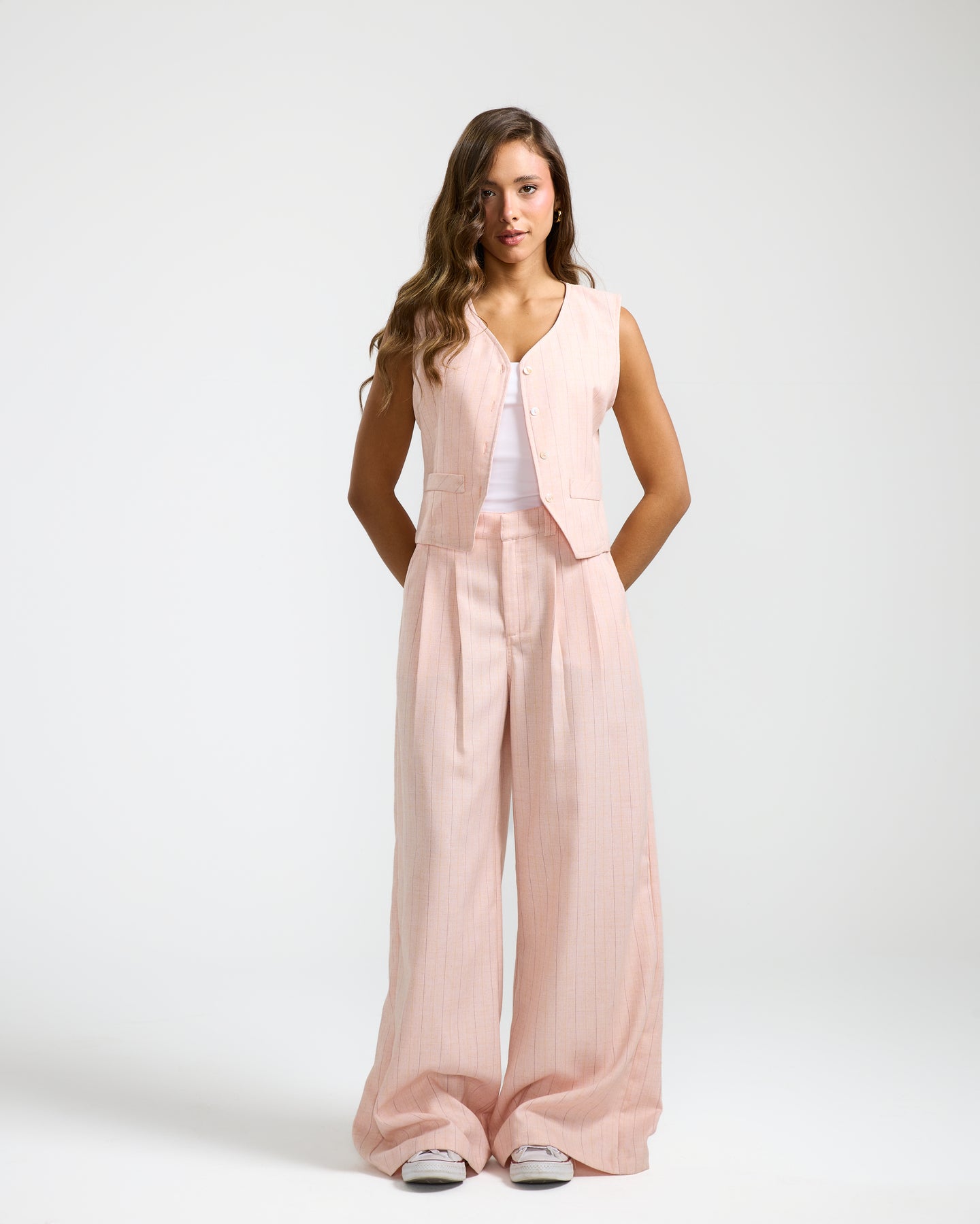 These blush wide-leg pants feature a soft drape and subtle pinstripes — fluid, tailored, and effortlessly feminine.Made from blended wool.