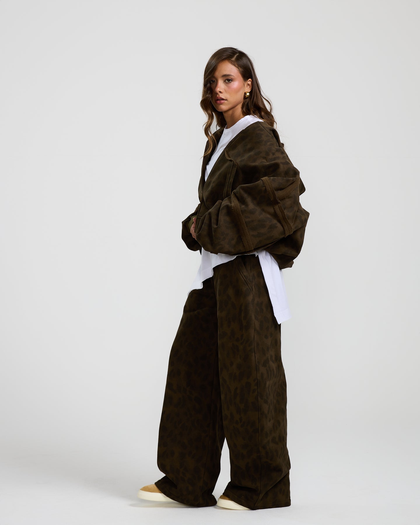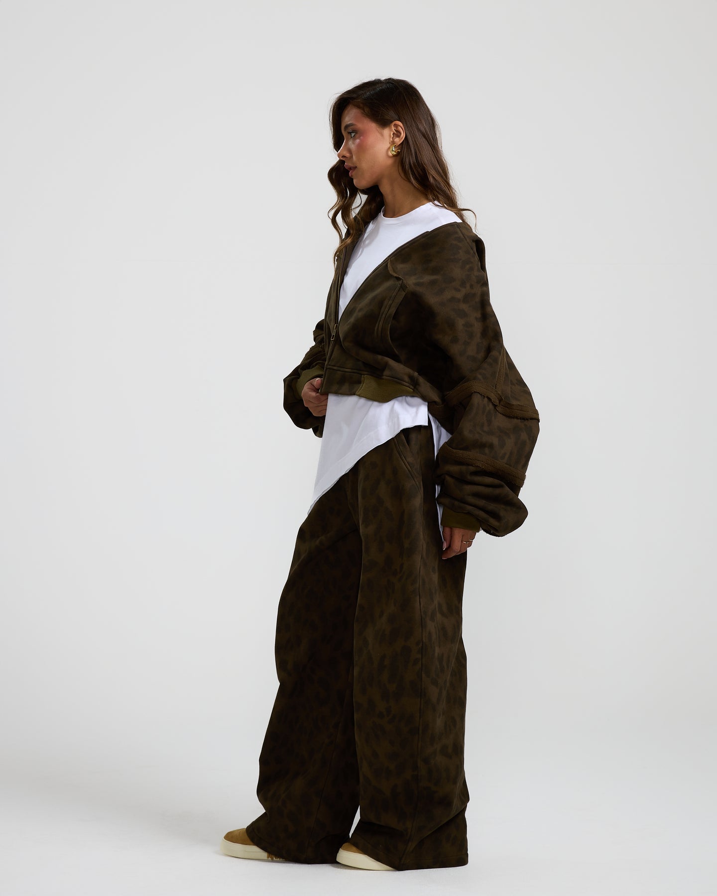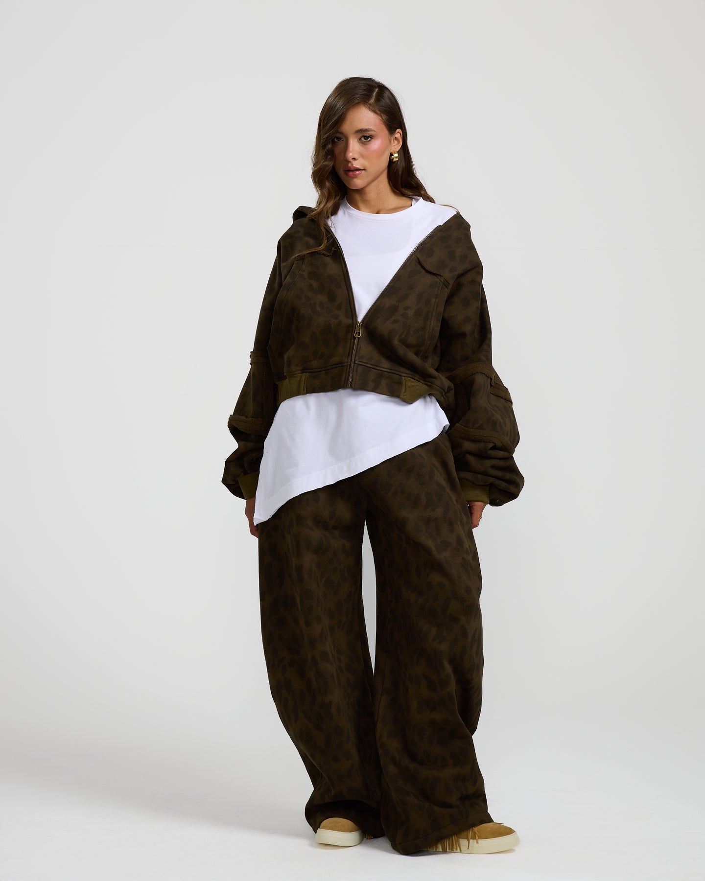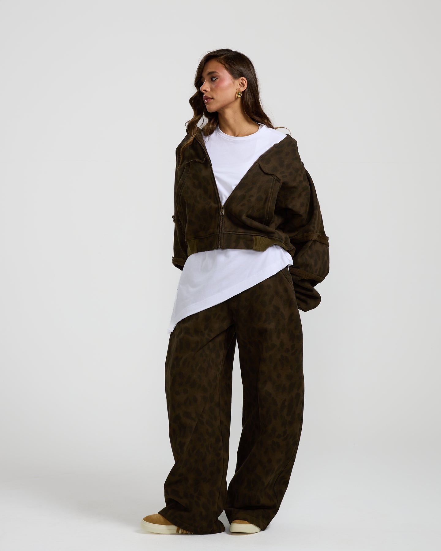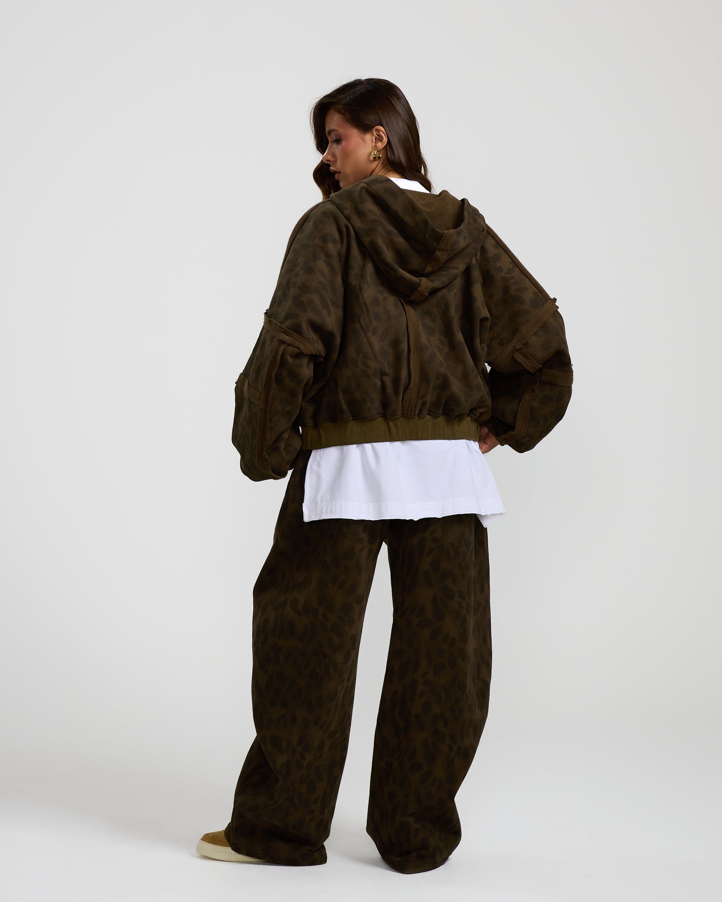 This olive, cropped leopard hoodie adds a bold touch with its edgy print, relaxed fit, and cool cropped cut.