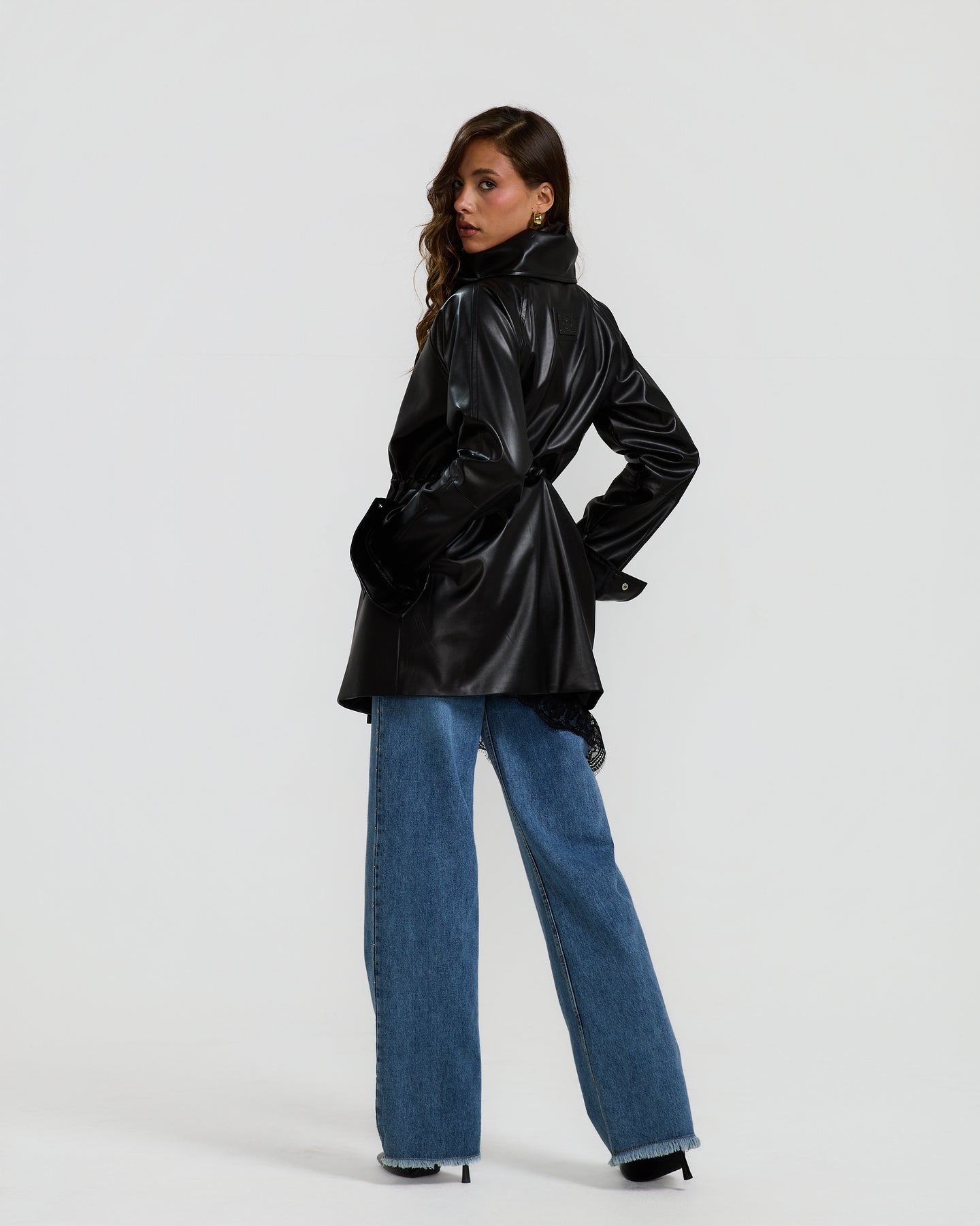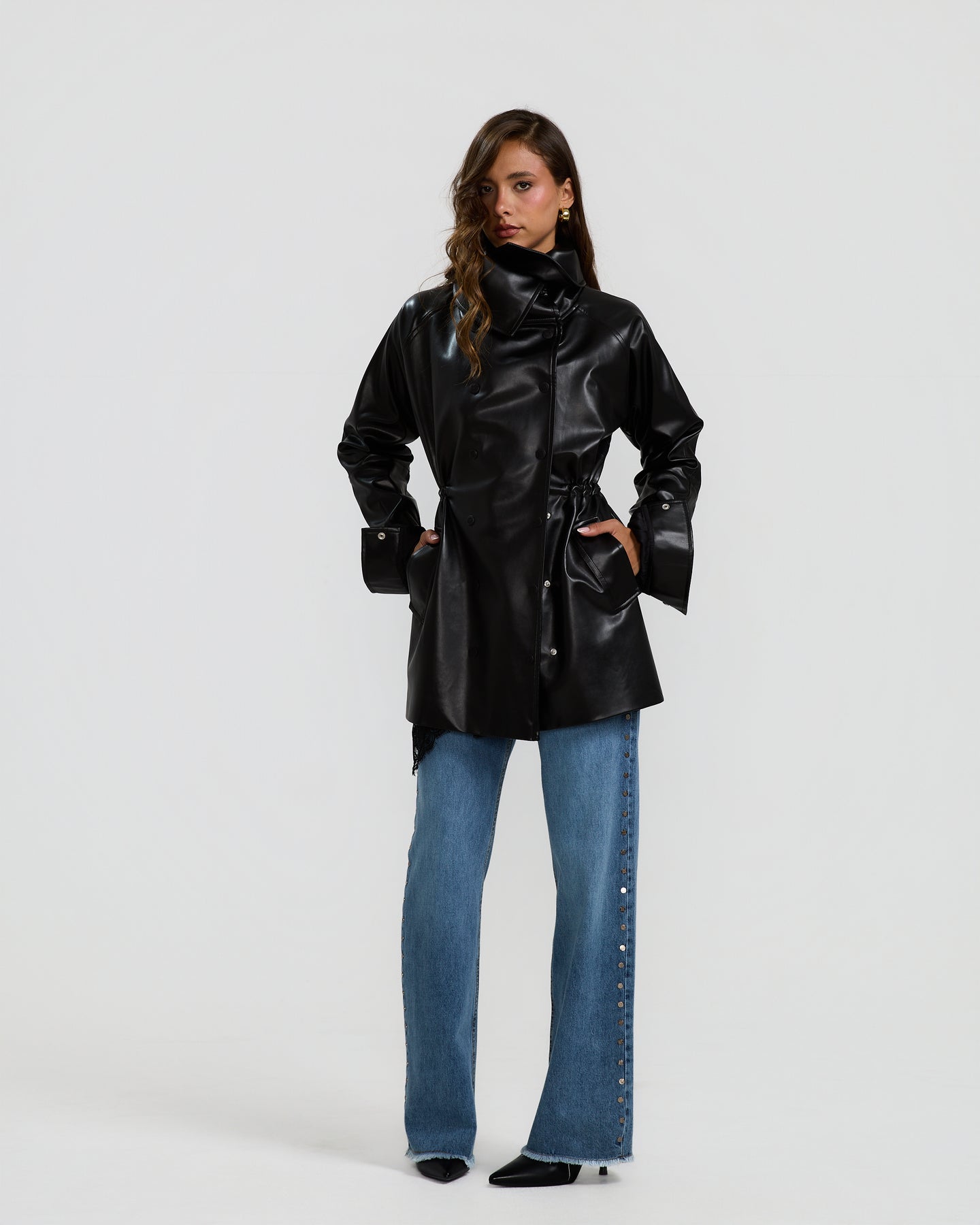 A sleek black leather jacket with a high structured collar, relaxed fit, and statement sleeves, giving off a bold, confident, and effortlessly cool vibe.