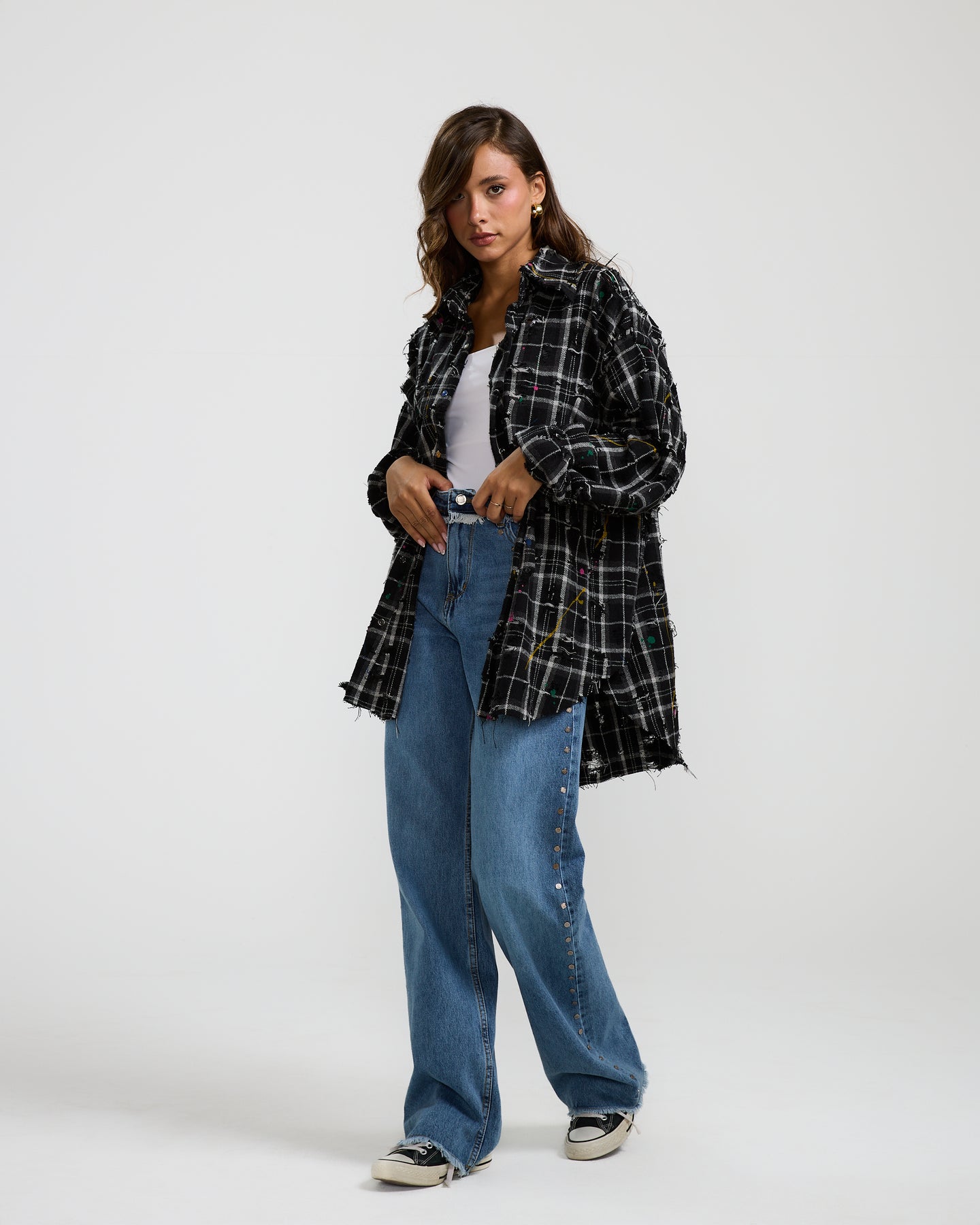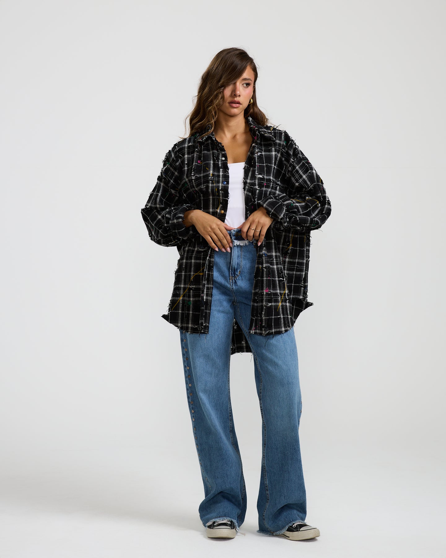 This two-piece checker wraparound shirt features a distressed plaid texture and asymmetric drape, striking the perfect balance between effortless edge and modern structure.