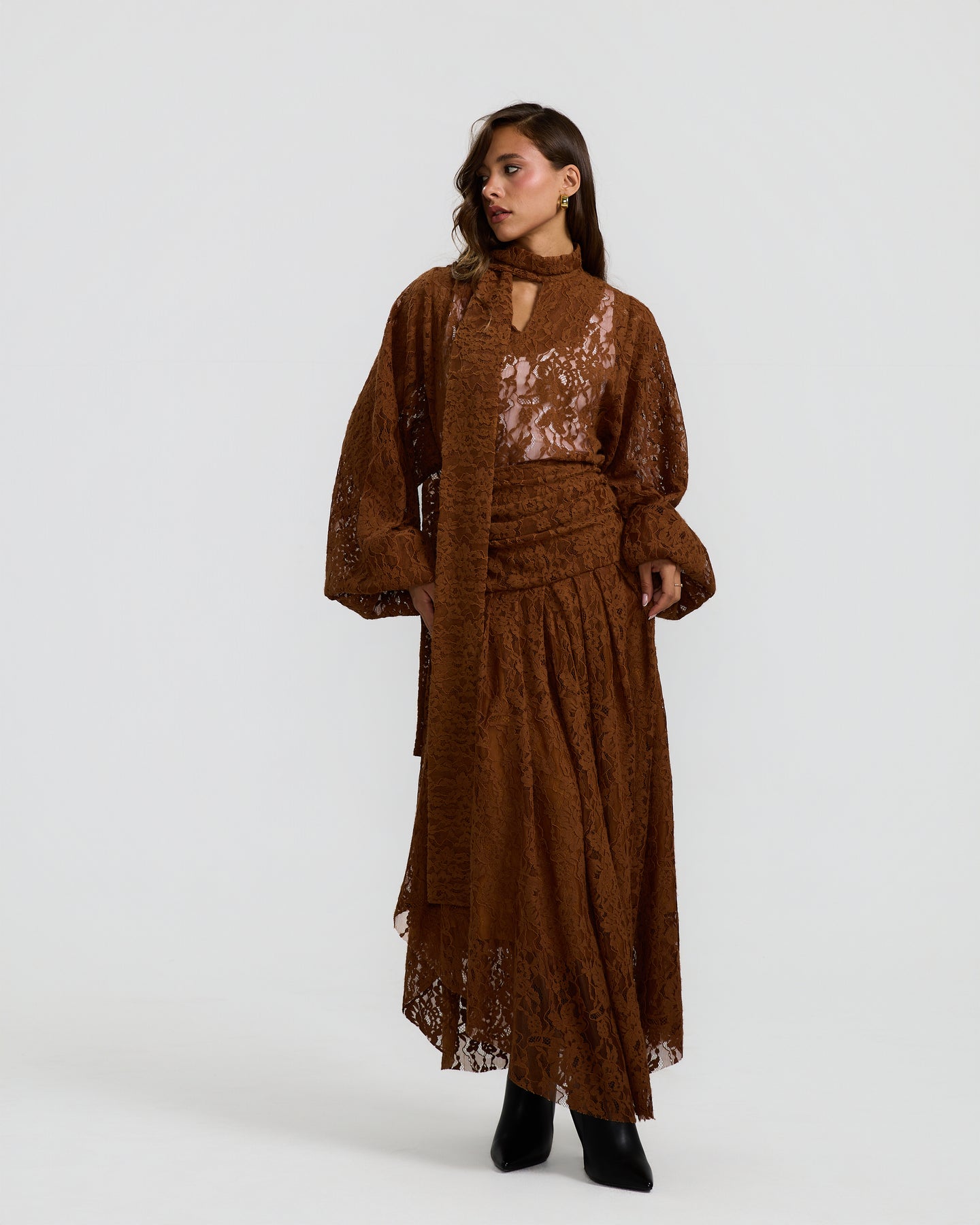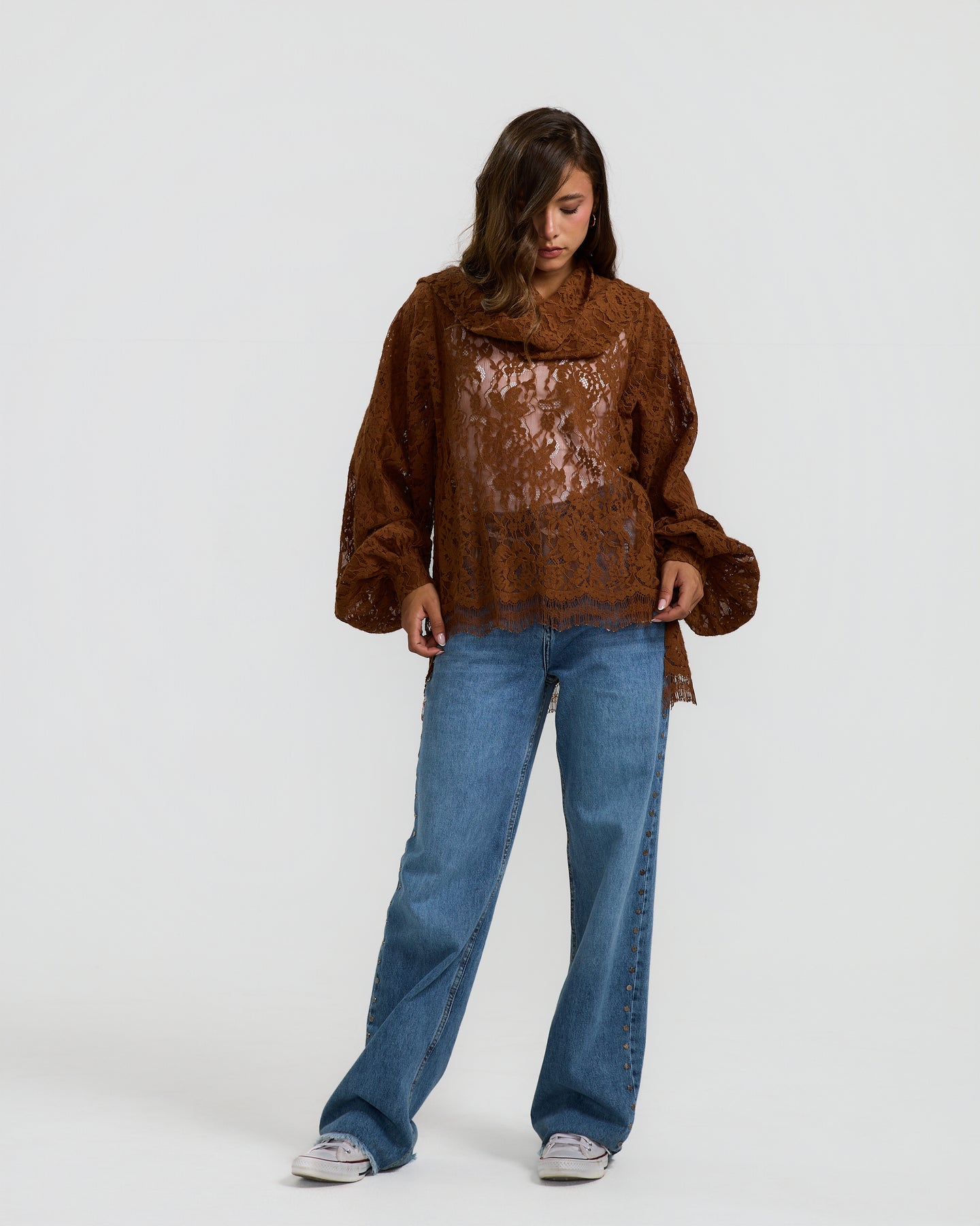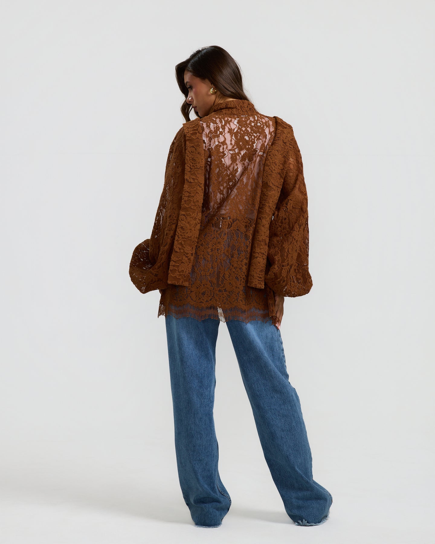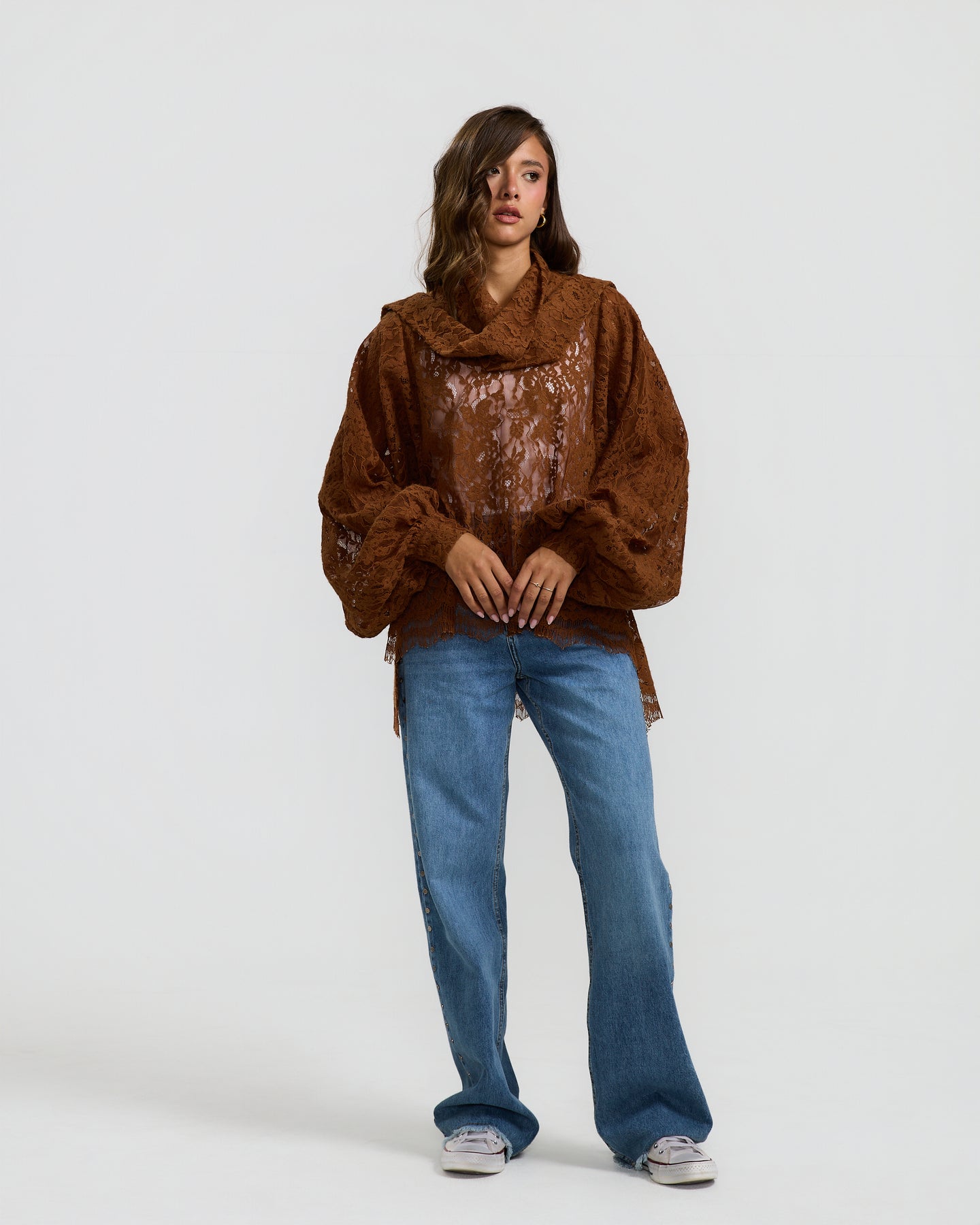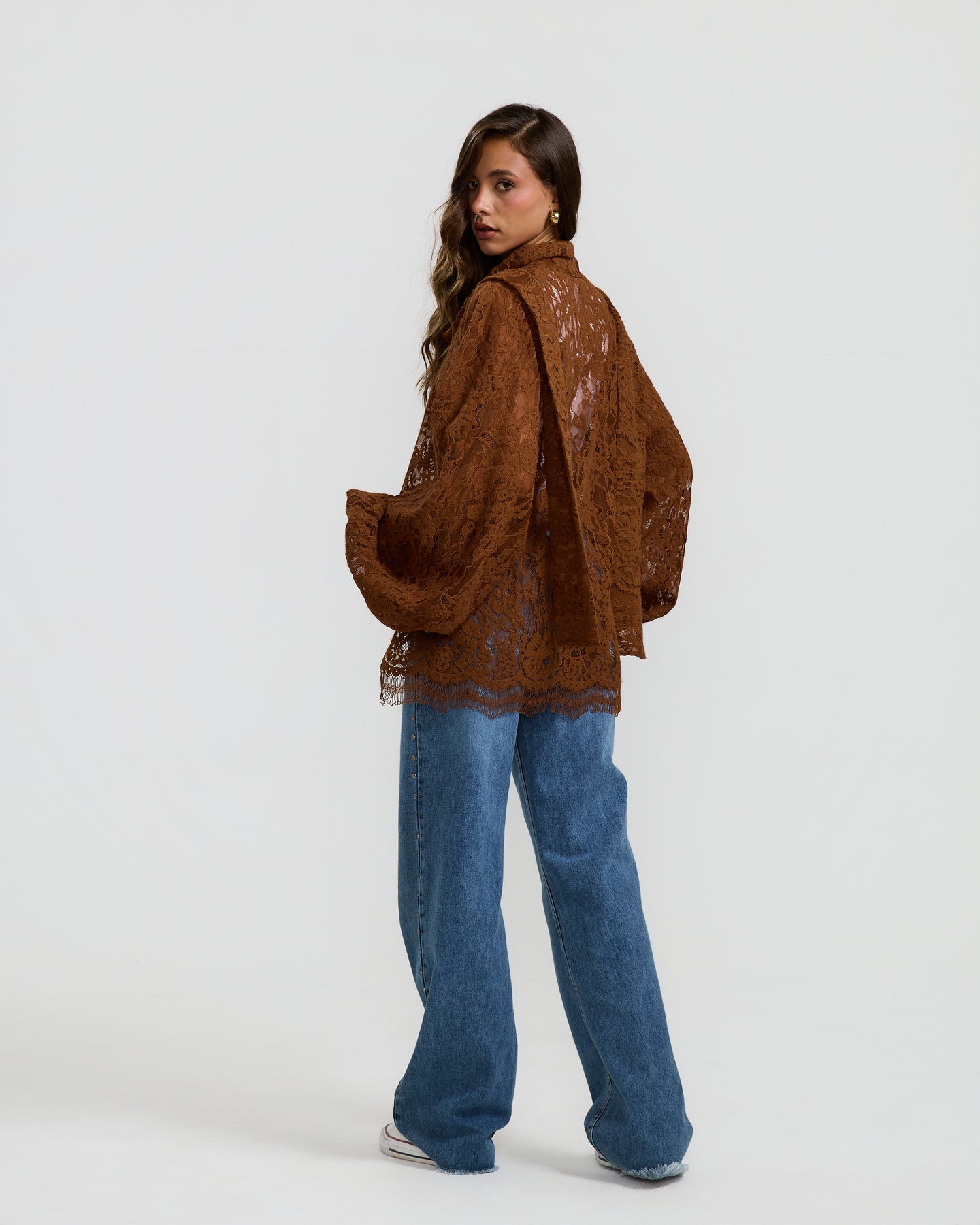 A statement wool lace top with a soft sheer finish, voluminous balloon sleeves, and a draped neckline that adds depth and texture to the look.