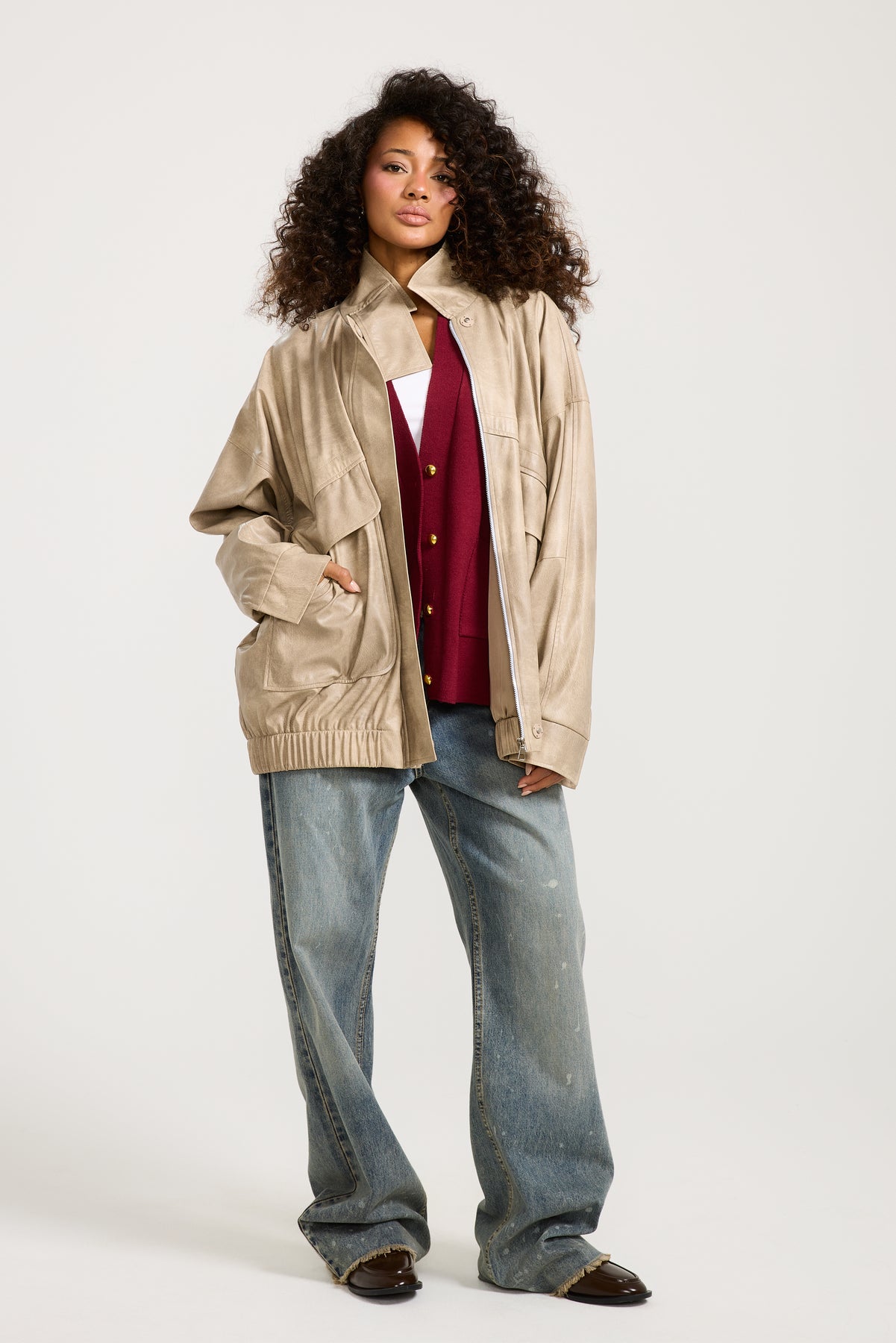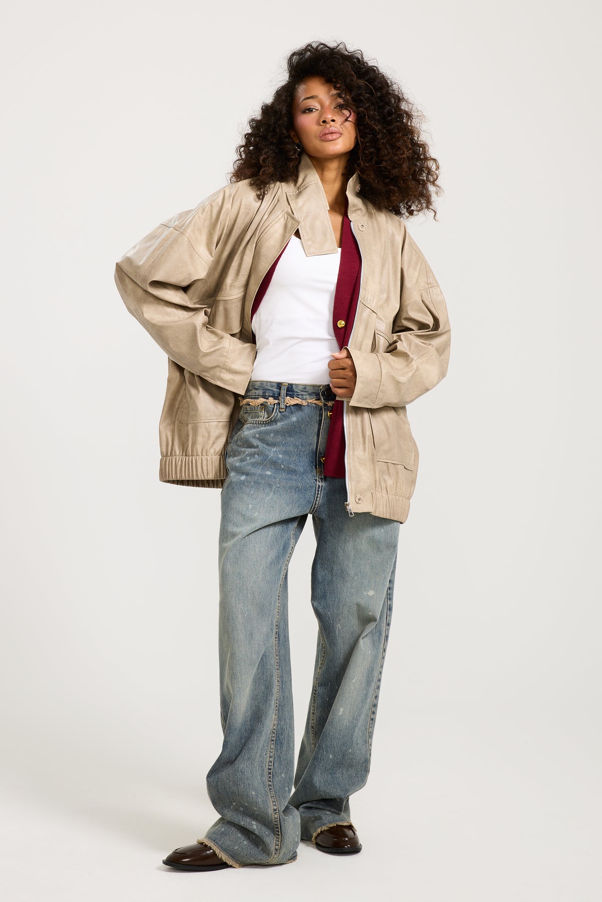 This oversized leather bomber jacket features a relaxed fit with a cool, effortless edge, perfect for layering over any casual look.