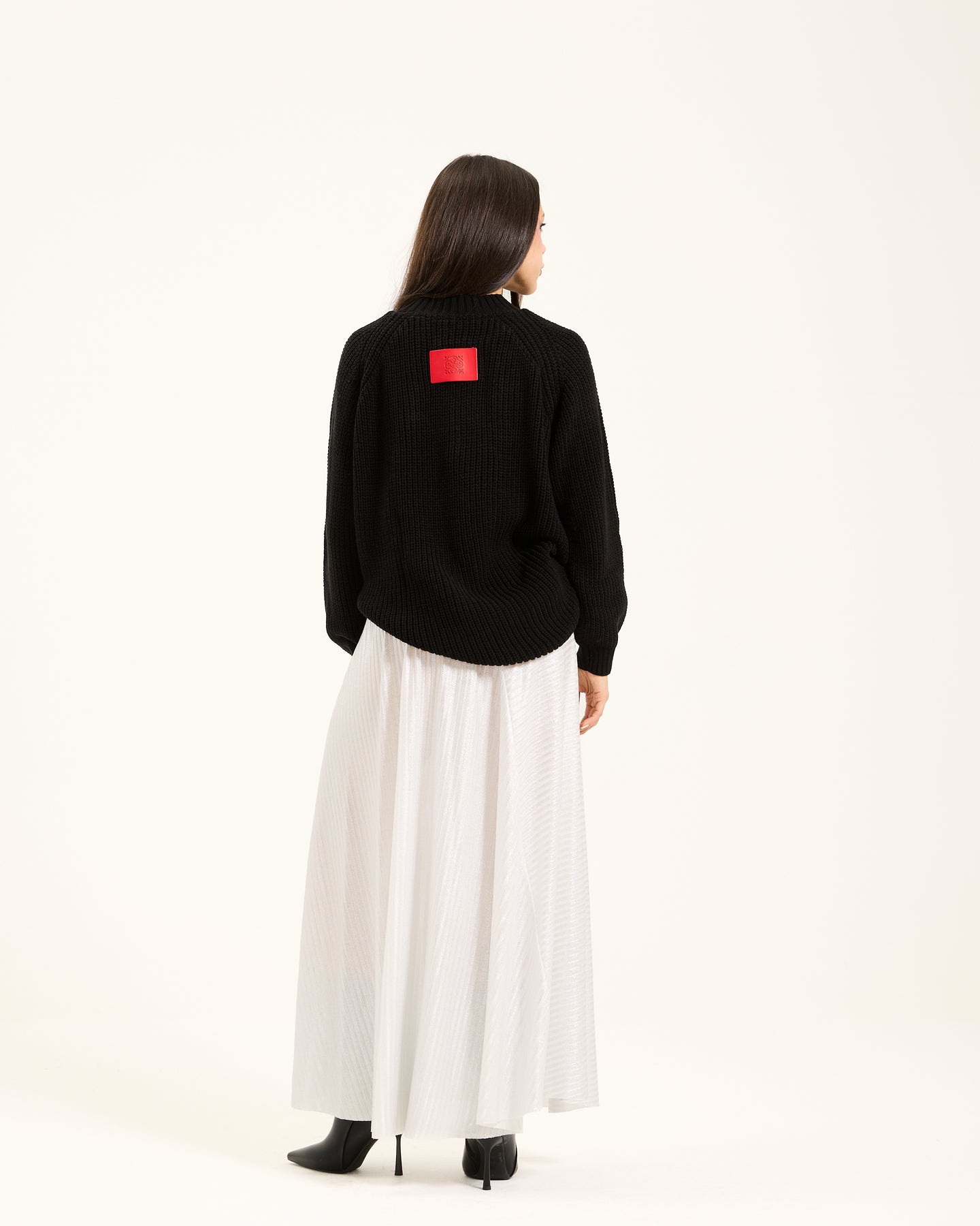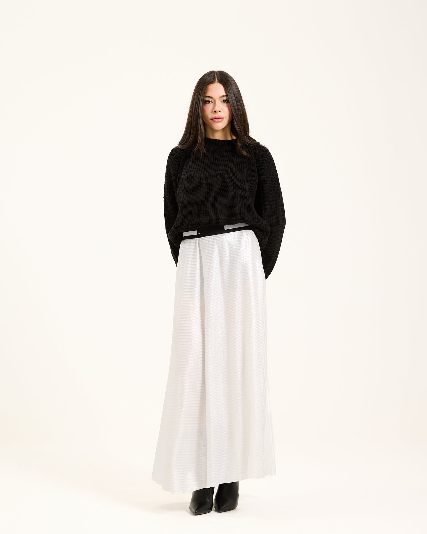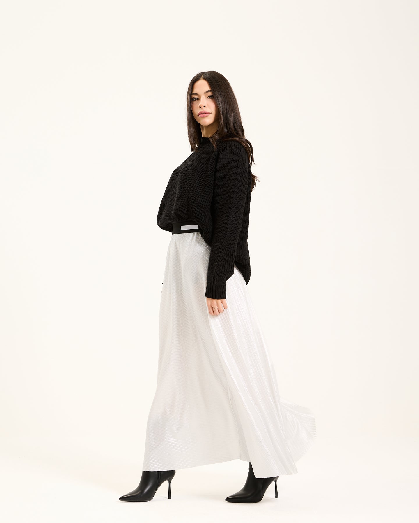 This asymmetrical skirt is where cozy meets chic; its striped shiny material will elevate any outfit while maintaining comfort.