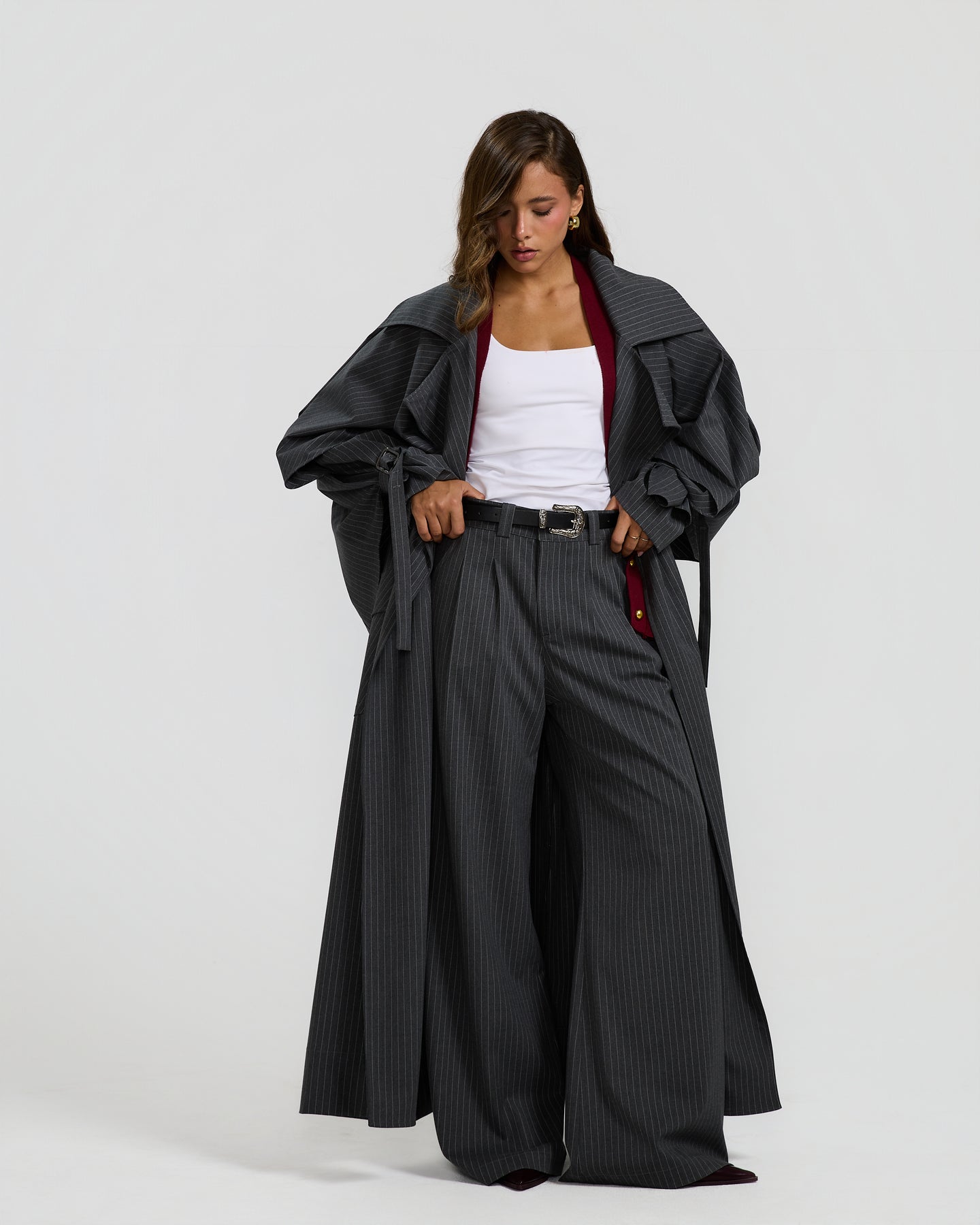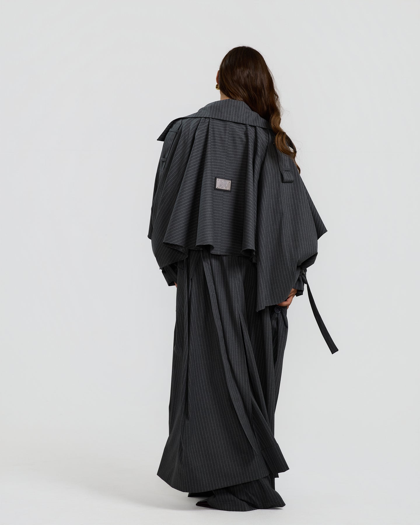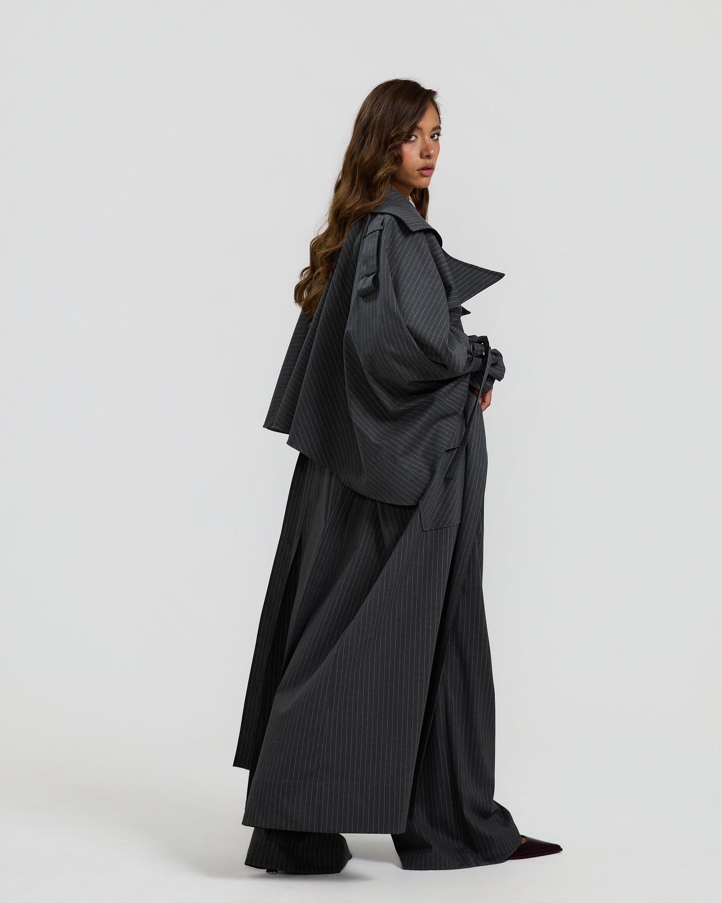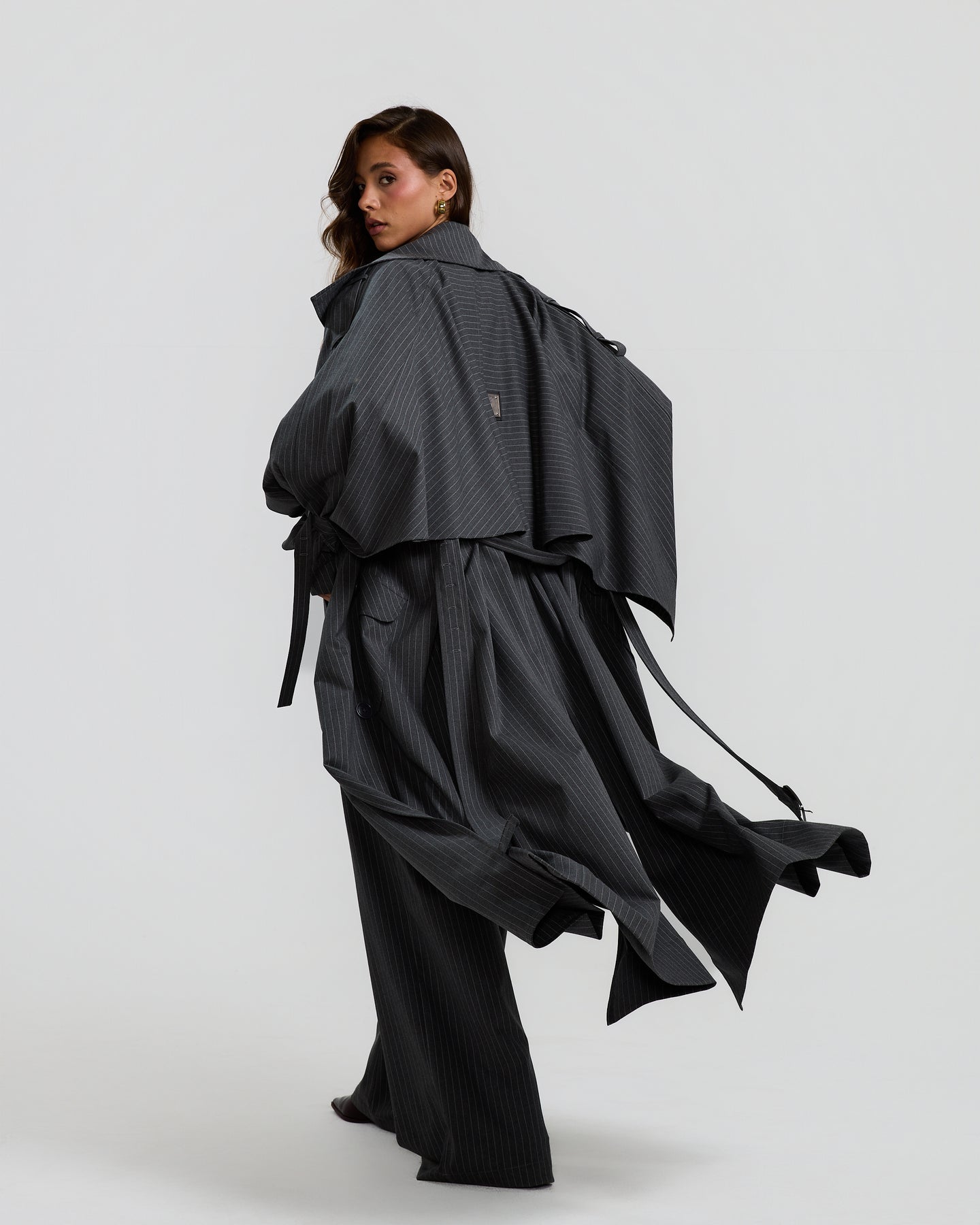 This trench coat is navy with stripes, with buttons all the way down, and can be cinched at the wrist, perfect for everyday, and can be dressed up or down accordingly
